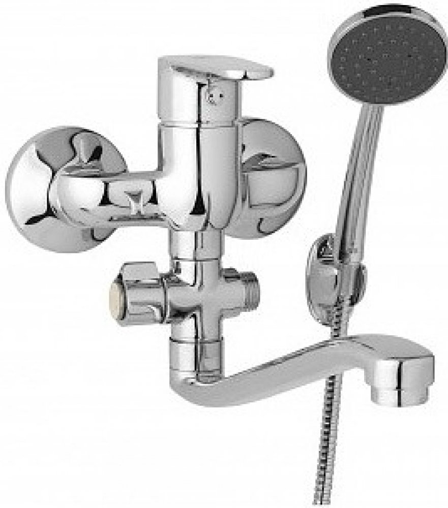 Nástěnná dřezová a umyvadlová baterie, rozteč 100 mm. keramický otočný přepínač. Včetně sprchové hadice, ruční sprchy a držáku sprchy. Montážní sada včetně těsnění s nerezovým sítkem je součásti balení. Otočné ramínko, délka 300 mm.