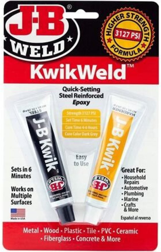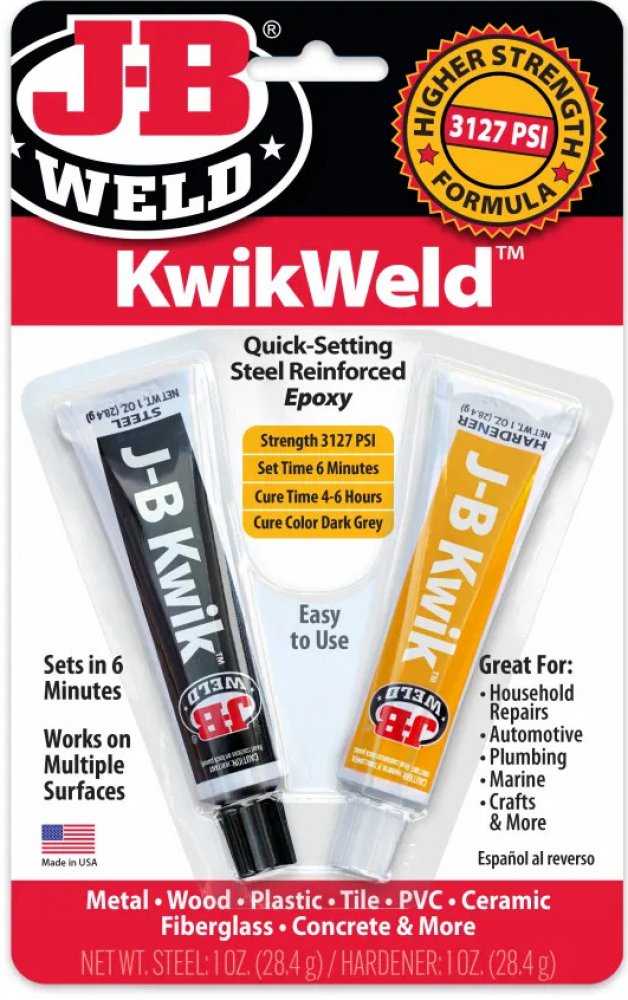 KwikWeld je rychleschnoucí verze dvousložkového epoxidového systému lepení pro svařování za studena. Kwik Weld, který zajišťuje silné a trvalé opravy kovu a mnoha dalších typů povrchů je jednou z nejoblíbenějších verzí lepidel J-B WELD. Po promíchání vytvoří trvalou vazbu a po vytvrzení ji lze tvarovat, závitovat, pilovat, brousit, vrtat či nanášet povrchovou úpravu. KwikWeld má poměr míchání 1:1,...