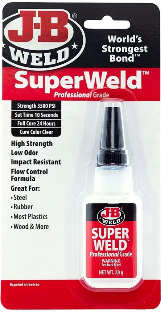 Lepidlo SuperWeld je speciálně vyvinuté kyanoakrylátové superlepidlo, které poskytuje velmi silný a okamžitý spoj při lepení různorodých materiálů. Lepidlo tuhne do 10-ti sekund a do finální tuhosti spoj vytvrdne do 24 hodin. Vteřinové lepidlo SuperWeld™ vytvrzuje do pevnosti 3500 PSI (=246 kg/cm2 = 24,13 Mpa).