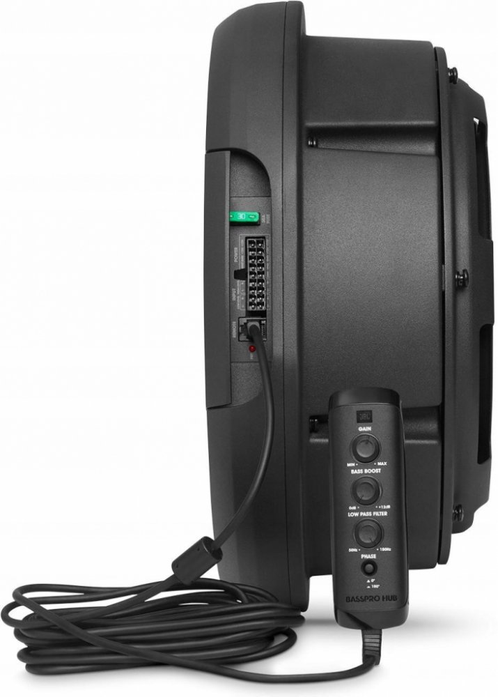 Nový subwoofer JBL BassPro Hub zaručuje perfektní provoz bez zabírání místa cestujícím nebo v kufru. Integrovaný aktivní subwoofer se perfektně vejde do středu rezervního kola a zaručuje bezproblémovou montáž a zvukový systém mimo dohled. Vestavěný zesilovač třídy D poskytuje výkon 200 W RMS a s subwooferem BassPro Hub a krytem tvoří celý systém. Lehká 11palcová (279 mm) membrána subwooferu ze skleněných vláken s gumovým odpružením zajišťuje sílu a úder zaručený basy JBL. Ochrana proti přehřátí (OTP) a ochrana proti přebití (OCP) zaručují správnou funkci při vysoké úrovni hlasitosti. Přiložený dálkový ovladač umožňuje nastavit spodní mezní frekvenci, zesílení, fáze a zvýšení basů o 12 dB, kdykoli se vám zachce. Bez ohledu na to, zda jezdíte klidně nebo závodíte, JBL BassPro v okamžicích nechává konkurenci za sebou.