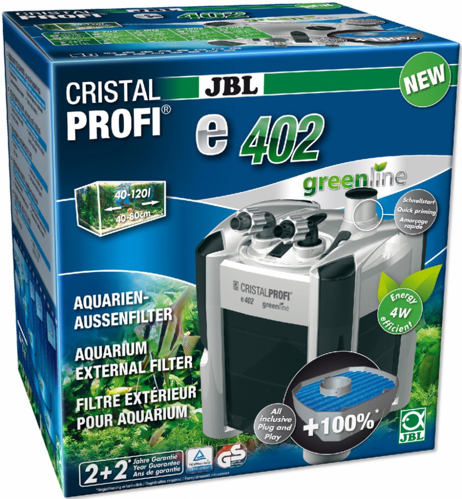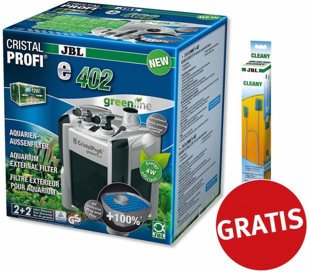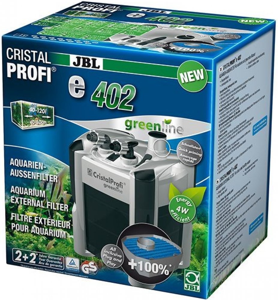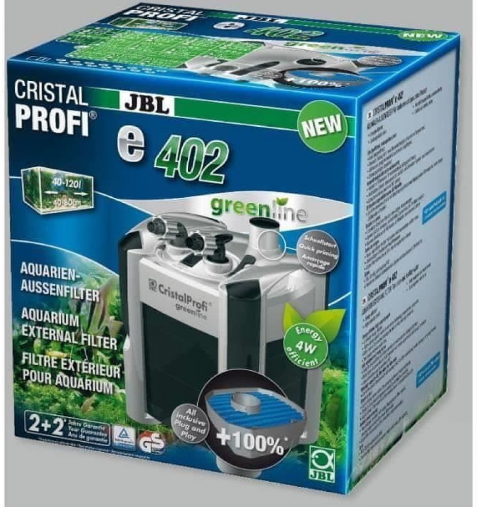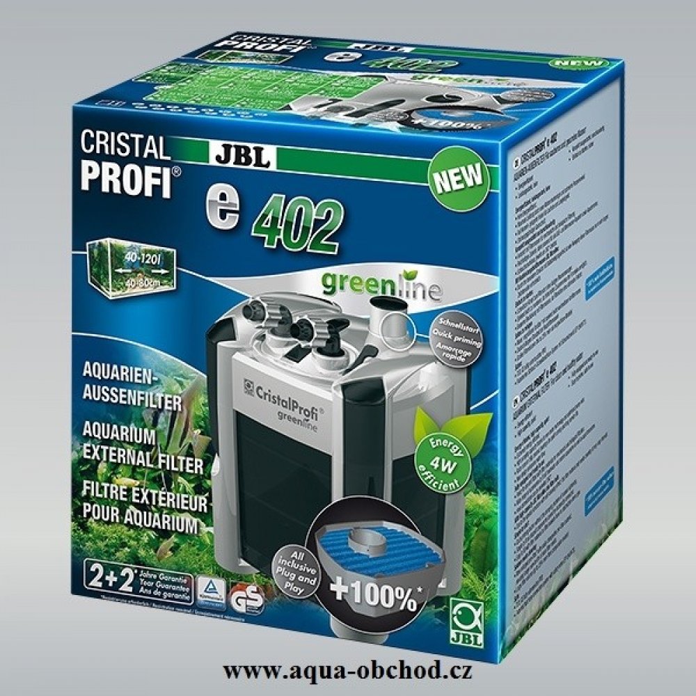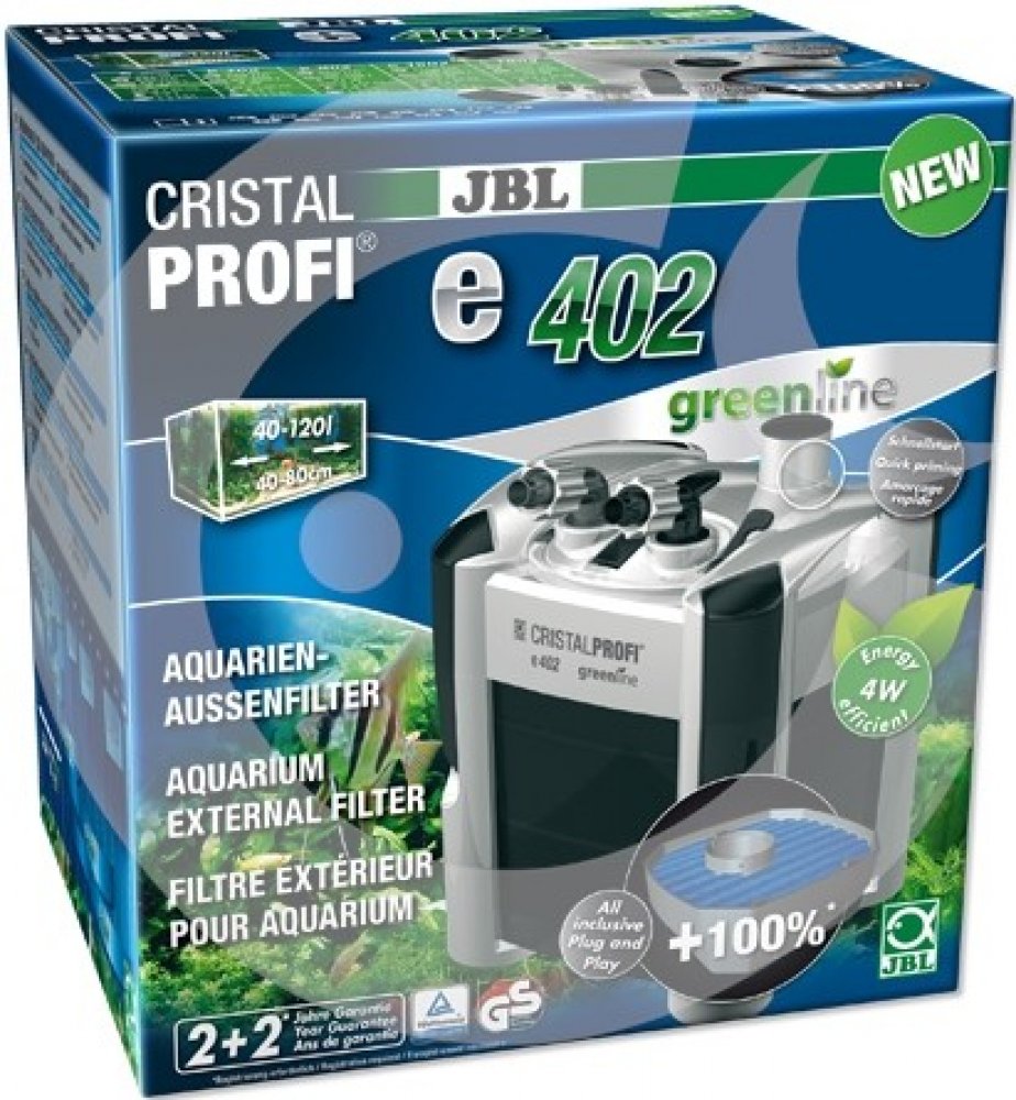Se spotřebou 4 W je CristalProfi e402 velmi energeticky úsporný. Při konstantně účinné cirkulaci vody přístroj spotřebovává o 31 % méně energie než jiné srovnatelné předchozí modely. Patentovaný blok pro připojení hadic s bezpečnostním ventilem brání úniku vody při odpojování filtru. JBL CristalProfi je schválen zkušebnou TÜV.