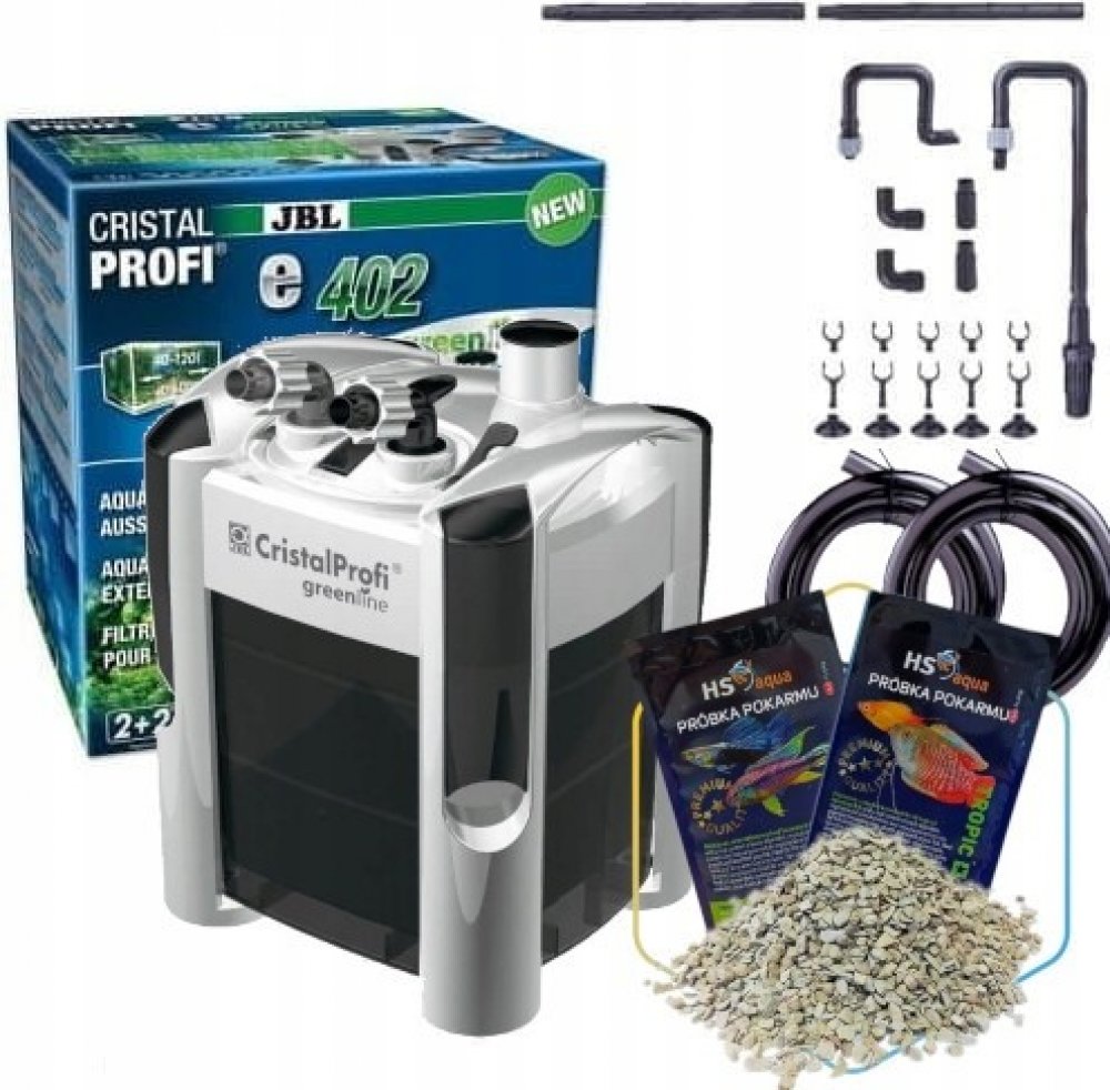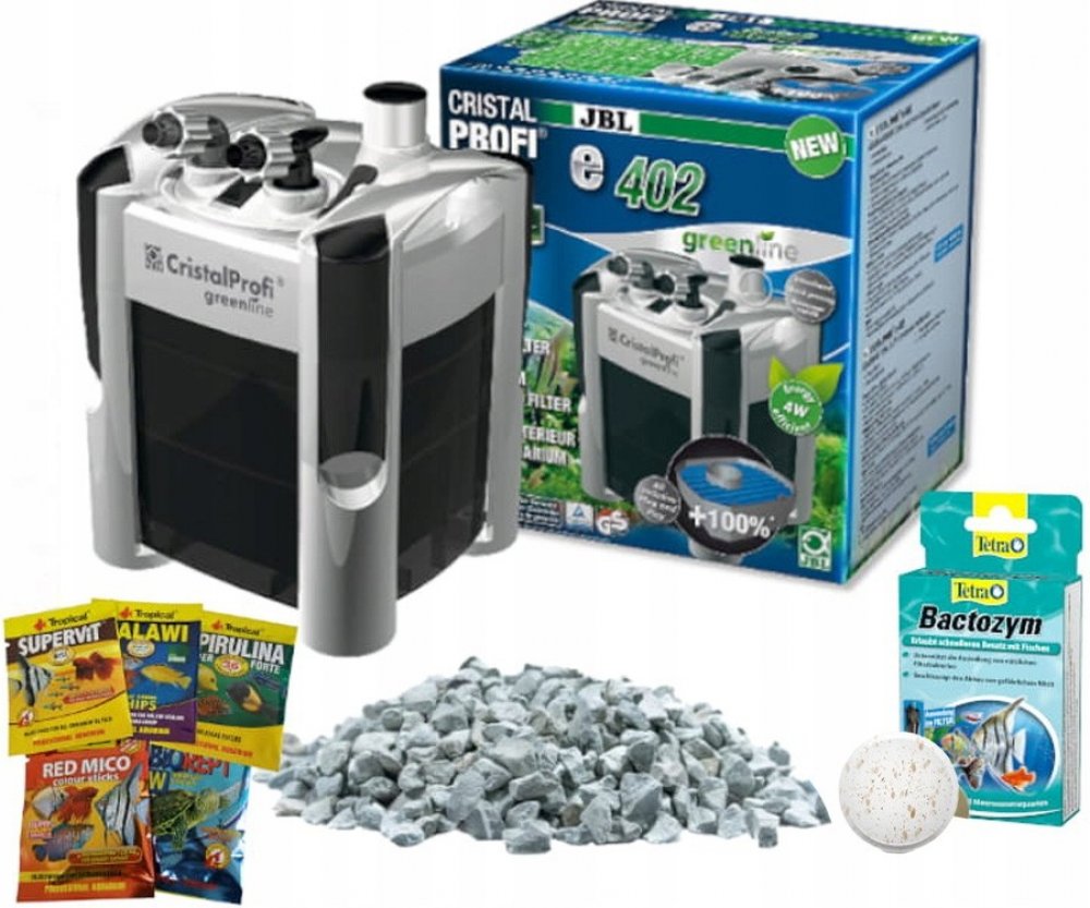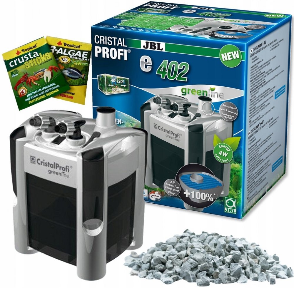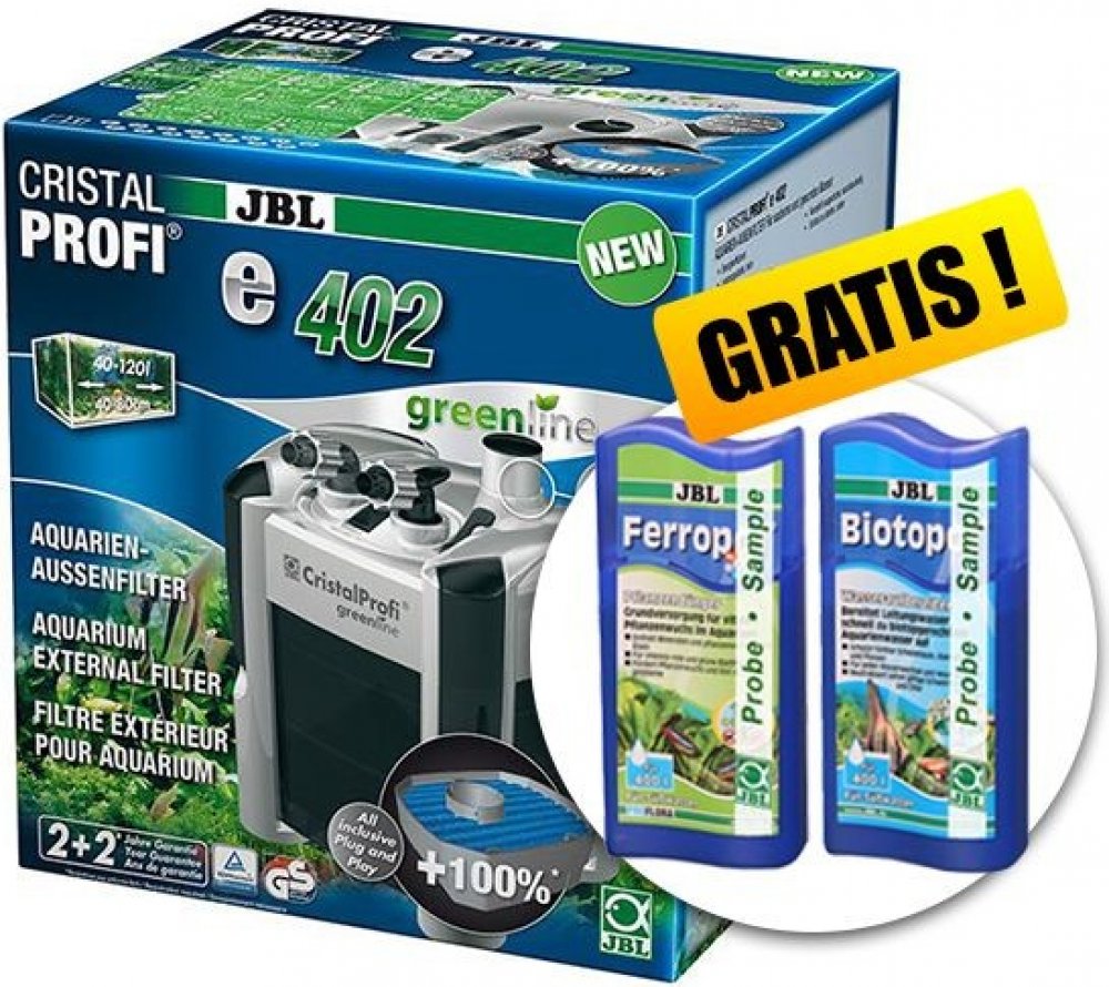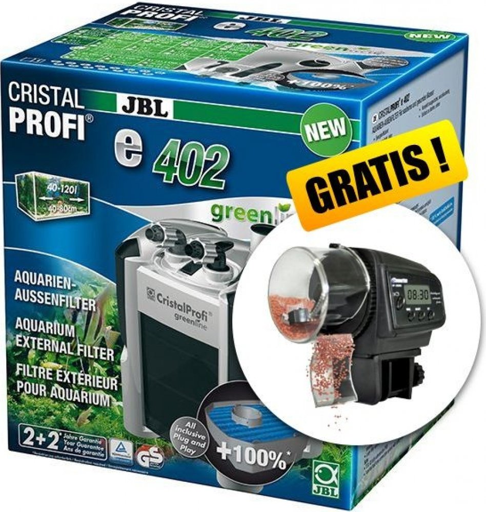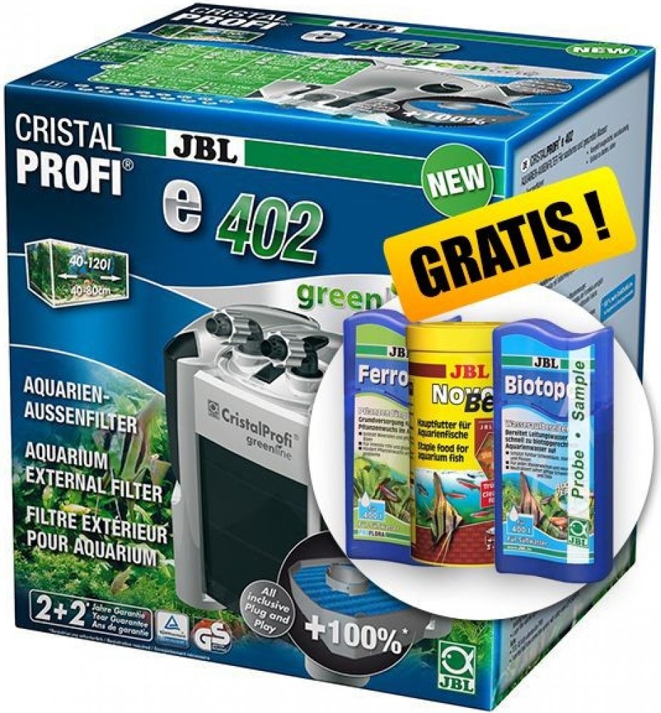 Se spotřebou 4 W je CristalProfi e402 velmi energeticky úsporný. Při konstantně účinné cirkulaci vody přístroj spotřebovává o 31 % méně energie než jiné srovnatelné předchozí modely. Patentovaný blok pro připojení hadic s bezpečnostním ventilem brání úniku vody při odpojování filtru. JBL CristalProfi je schválen zkušebnou TÜV.