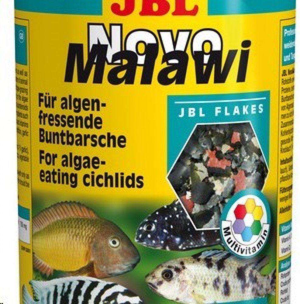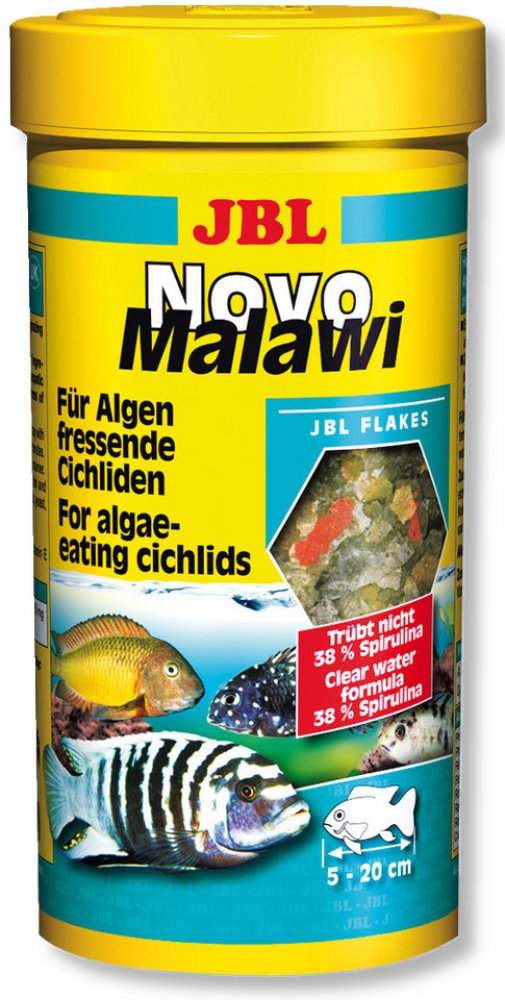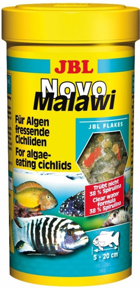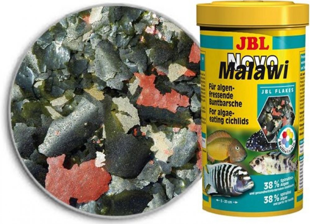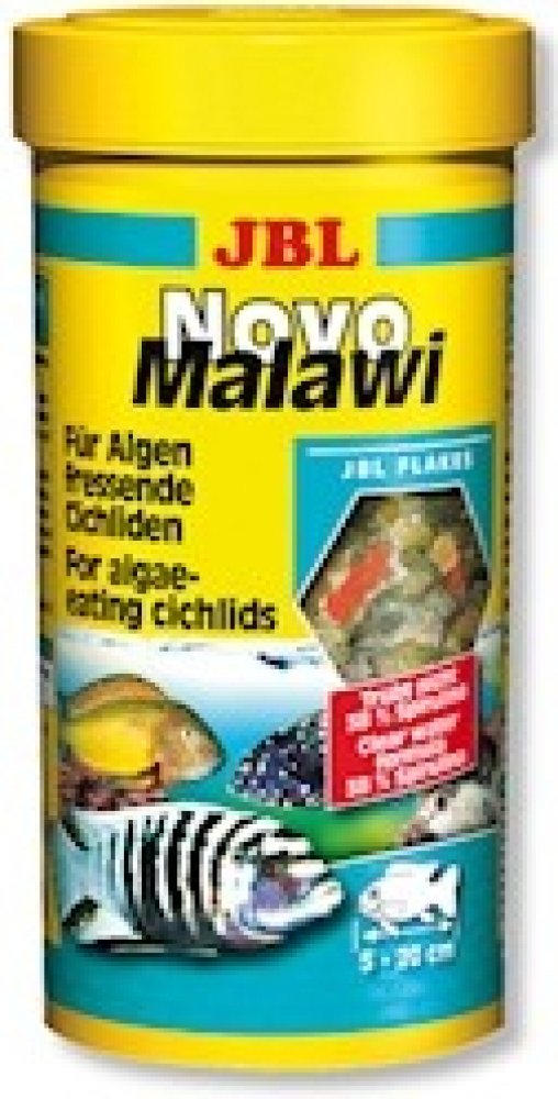 JBL NovoMalawi je kompletní vločkové krmivo pro rostlinožravé cichlidy jezer Malawi a Tanganjika. Krmivo má vysoký obsah řasy Spiruliny (38%), dále obsahuje česnek (1%), ale má i podíl krevetek a planktonu. Vločky se v akvárku více rozptýlí a tím je zajištěno, že se ke krmivu dostanou i opravdu plaché rybky a naopak silně dominantní jedinci se nepřecpou, tím se u nich snižuje riziko vzniku trávicích potíží. Obrázek je pouze ilustrační