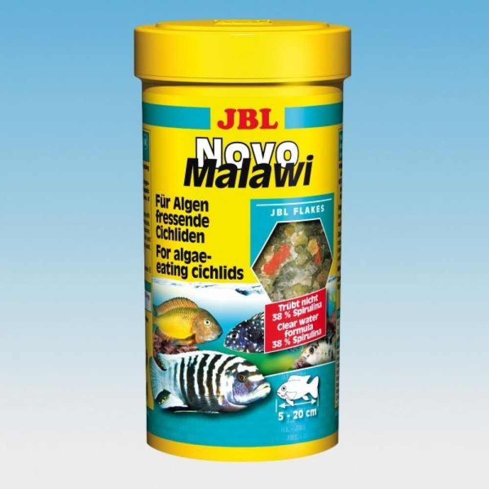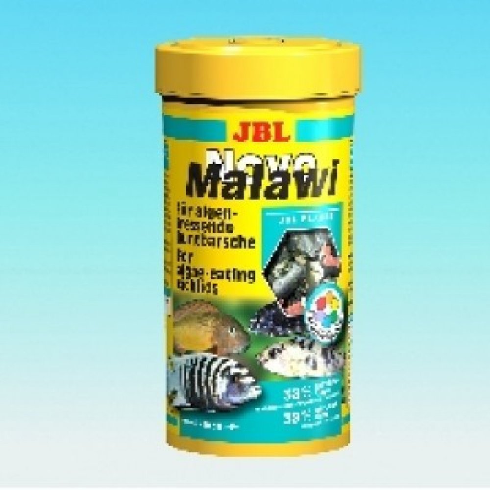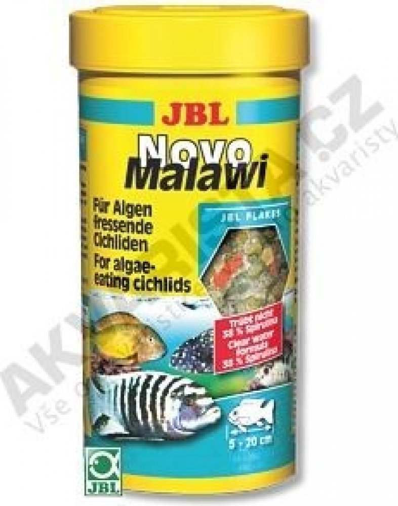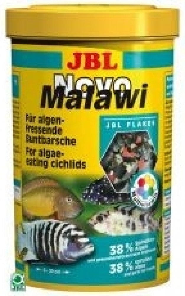 JBL NovoMalawi je kompletní vločkové krmivo pro rostlinožravé cichlidy jezer Malawi a Tanganjika. Krmivo má vysoký obsah řasy Spiruliny (38%), dále obsahuje česnek (1%), ale má i podíl krevetek a planktonu. Vločky se v akvárku více rozptýlí a tím je zajištěno, že se ke krmivu dostanou i opravdu plaché rybky a naopak silně dominantní jedinci se nepřecpou, tím se u nich snižuje riziko vzniku trávicích potíží. Obrázek je pouze ilustrační