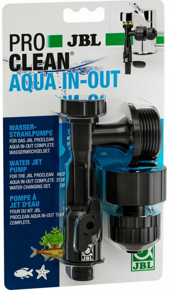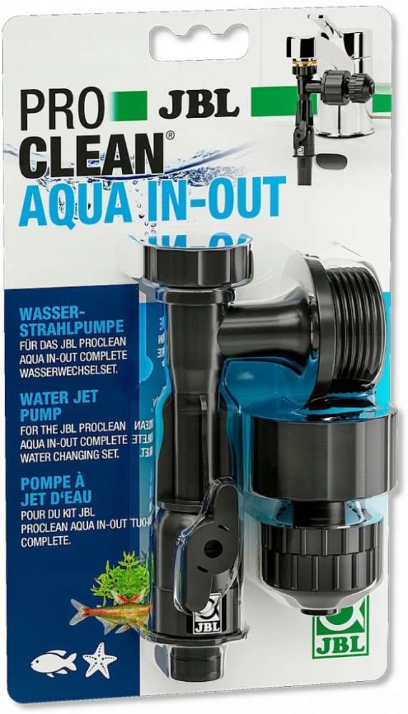 Rozsah dodávky: 1 x JBL PROCLEAN AQUA IN-OUT, kompletní vodní proudové čerpadlo, připojení: 3/4", s uzavíracím ventilem a těsnicím kroužkem, pohyblivé hadicové připojení (12/16) s bezpečnostní maticí, č. artiklu: 6142900. Závitové připojení 3/4", nutný adaptér pro upevnění na závit kohoutku (není součástí dodávky, obvykle M28 x 1, M24 x 1 nebo M24 x 1). Výroba sání protékající vodou z kohoutku, připojení hadice pro odsávání akvarijní vody, výměna páky pro opětovné plnění. Snadné použití, přišroubování na kohoutek, připojení hadice, otevírání kohoutku, páka pro volbu odsávání nebo plnění. Vodní proudové čerpadlo pro sadu na výměnu vody JBL PROCLEAN AQUA IN-OUT.