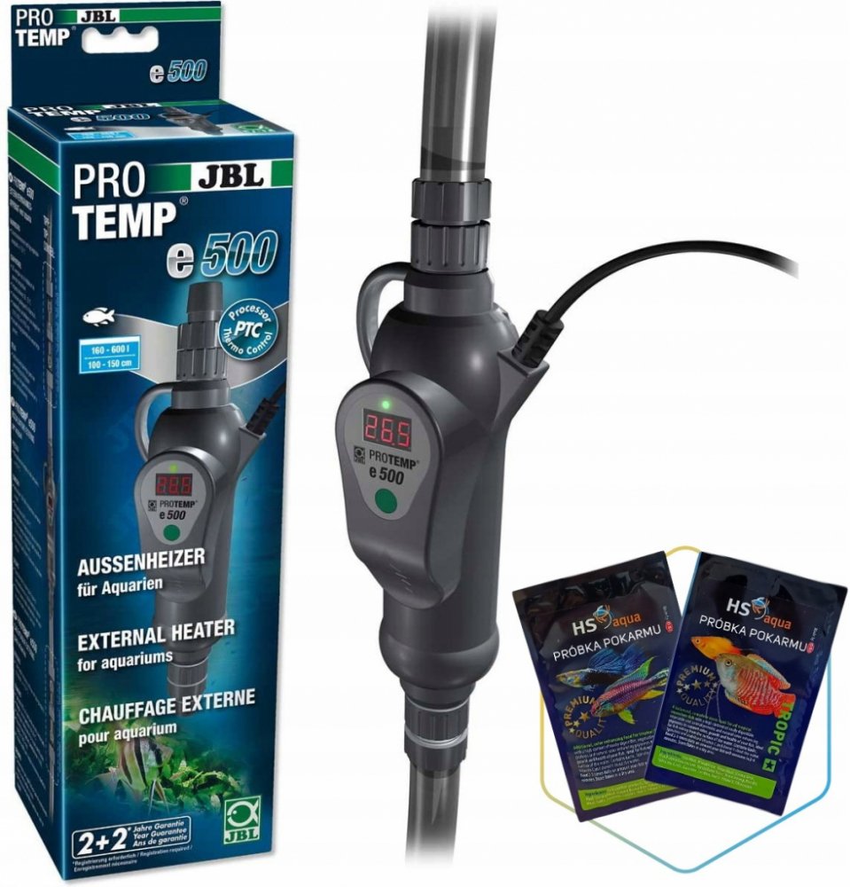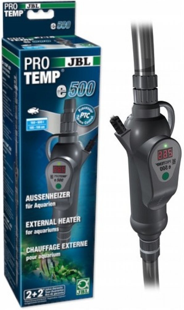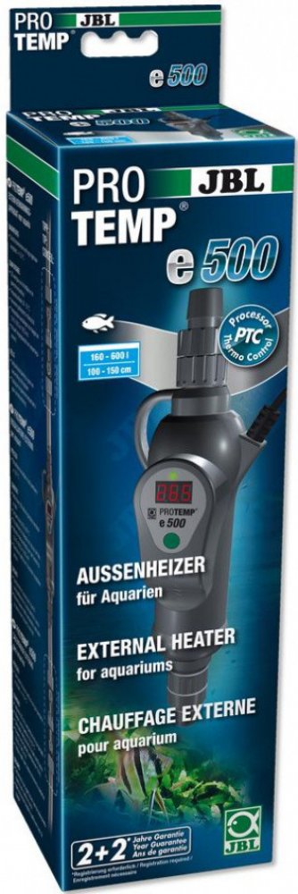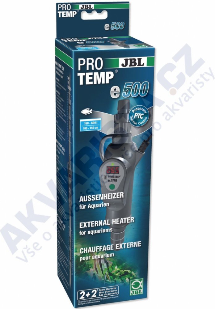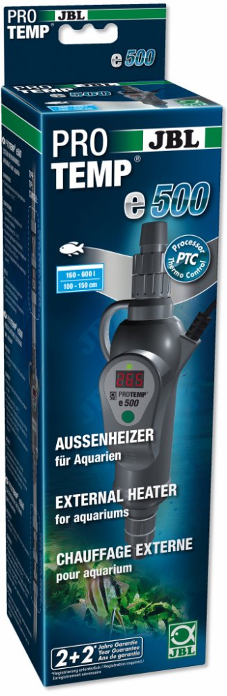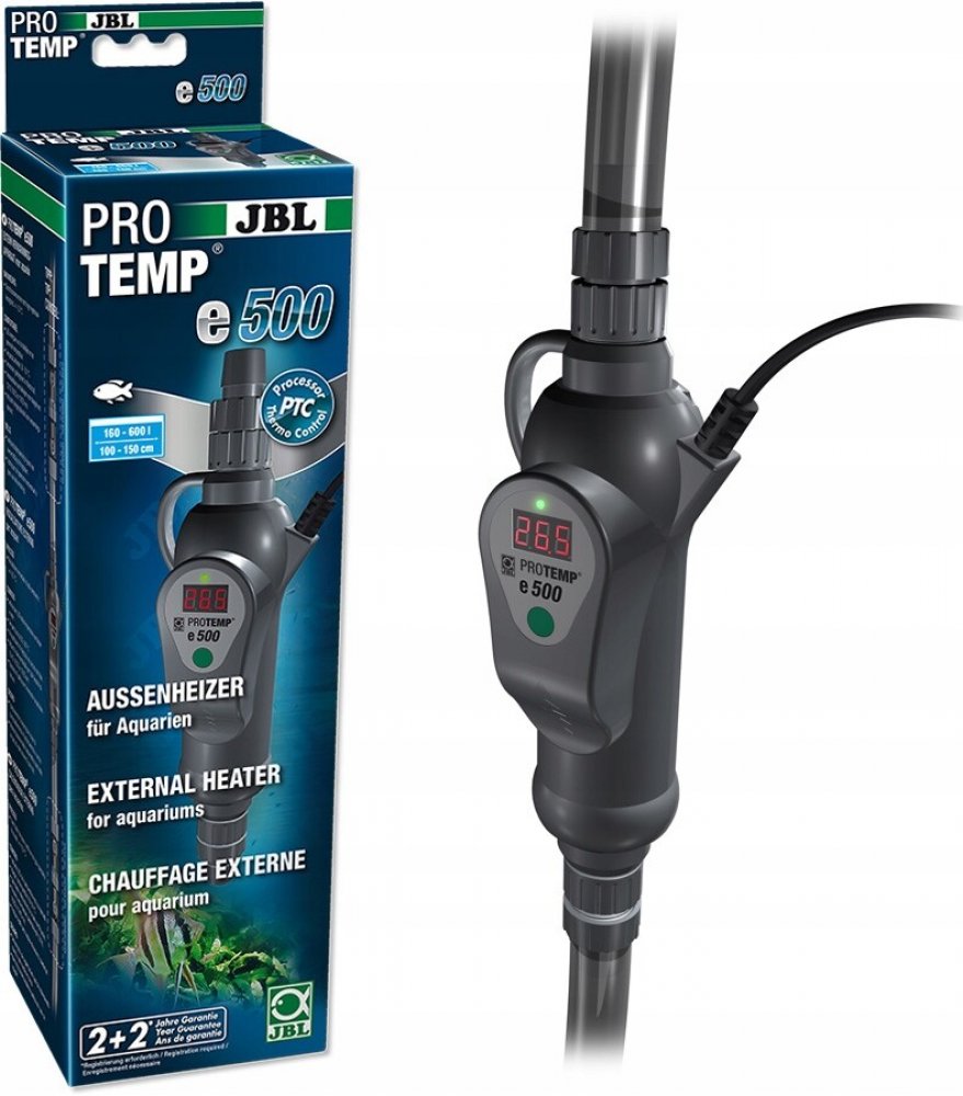 Obsah dodávky: 1 průtokový ohřívač 500 W pro akvária 160-600 l (100-150 cm) s přípojkami hadice na 12/16, 16/22 a 19/25 mm a čisticí kartáč