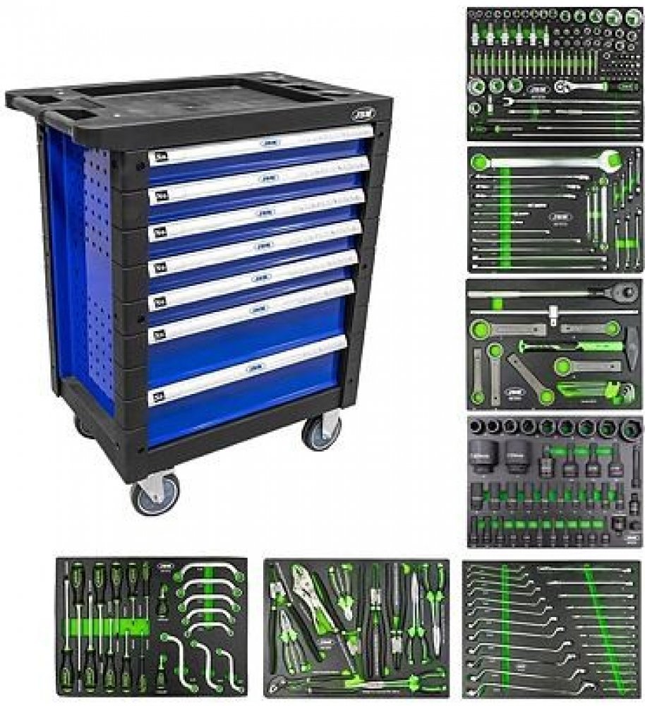Montážní dílenský vozík na nářadí JBM - speciálně pro TRUCK. 7 modulů s kvalitním ručním nářadím, 7 zásuvek různé výšky (5x výšky 74 mm, 2x výšky 151,5 mm), zcela otevíratelné na teleskopických pojezdech. Integrovaný zajišťovací systém proti samovolnému otevření zásuvek, centrální bezpečnostní zamykání vozíku. Velmi kvalitní a robustní konstrukce ocelové skříně vozíku pracovní plocha vozíku s povr...