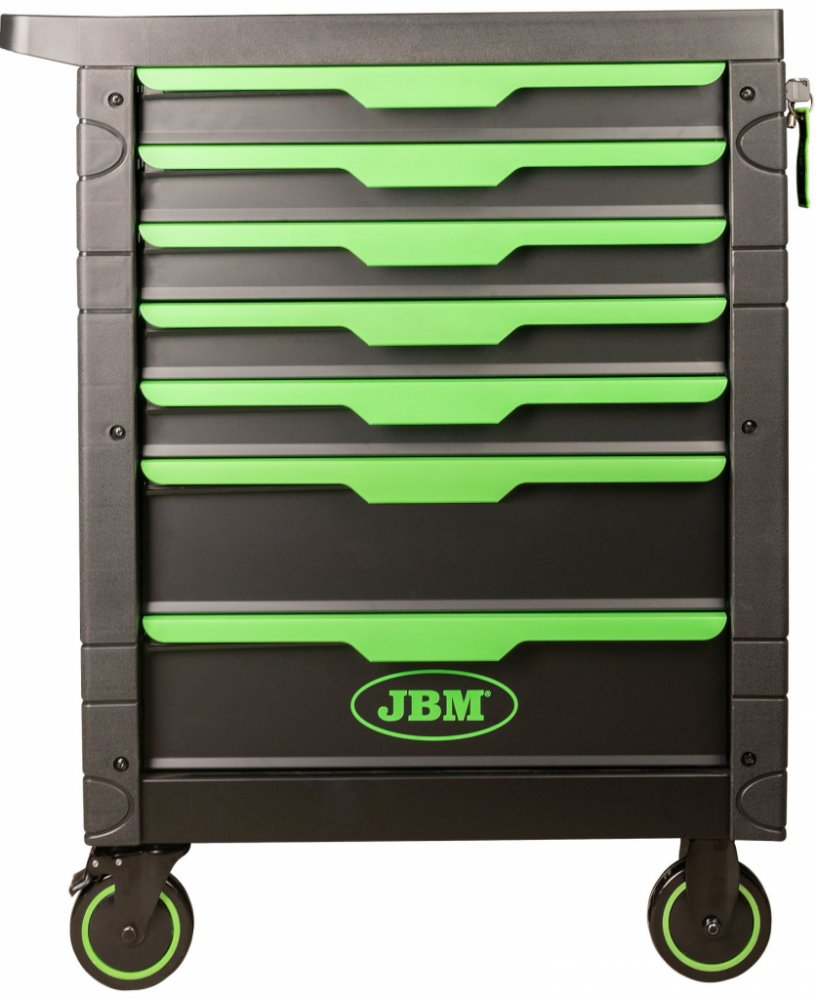 Práškové lakování odolné proti poškrábání Nosnost každé zásuvky až 40 kg Ergonomický plastový horní zásobník, nosnost až 125 kg Úložný prostor na boku pro uložení různých nástrojů Systém vnitřního zámku pro bezpečnost 5" Kolečka, 2 pevná kolečka a 2 otočná kolečka, jedno s brzdou Celková velikost: 775 x 466 x 960 mm Celková velikost s kolečky: 750 x 515 x 997 mm 6x zásuvky: 533 x 400 x 74 mm 1x zásuvky: 533 x 400 x 153 mm Velikost koleček: 5"
