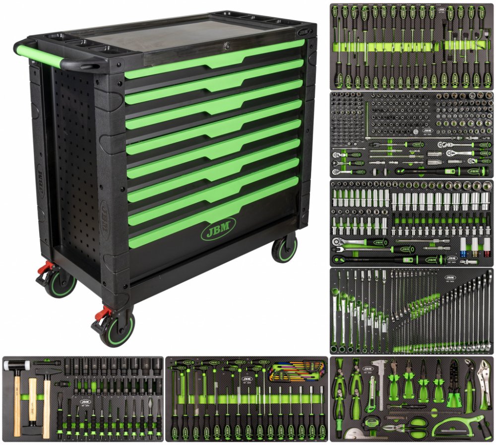Montážní dílenský vozík na nářadí JBM 54688, XL. Moduly s kvalitním ručním nářadím, 8 zásuvek různé výšky, zcela otevíratelné na teleskopických pojezdech. Zásuvka výšky 75 mm je ideální pro uložení modulů s nářadím. Zásuvky výšky 150 mm je ideální pro uložení spíše rozměrnějšího kusového nářadí. Nosnost zásuvky je 35 kg, nosnost horní plochy 55 kg a nosnsost celého vozíku je 335 kg. Integrovaný zajišťovací systém proti samovolnému otevření zásuvek, centrální bezpečnostní zamykání vozíku. Velmi kvalitní a robustní konstrukce ocelové skříně vozíku pracovní plocha vozíku s povrchem z nerezové oceli a okraji zabraňující pádu předmětu, ergonomické rukojeti po obou stranách pro snadnou manipulaci. Vozík na 4 kvalitních kolečkách (2x kolečka s brzdou, 2x otočná, průměr 127 mm). Boční strany vozíku s prolisy, na které lze zavěsit závěsné držáky. Montážní vozík JBM je konstrukčně velmi kvalitní dílenský vozík na nářadí pro Vaše každodenní využití s dlouhou životností. Součástí je sada modulů s nářadím - celý sortiment v souboru ke stažení.