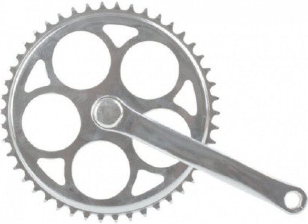Fe kliky s 1- převodníkem bez krytu - Délka klik: 170 mm - Počet zubů na převodníku: 46z - Určeno pro řetěz: 1/2 x 1/8 - Typ: 4-hran - JIS ( spojení se středovou osou na 4-hran) - Materiál: Fe - Určeno pro středovou osu: 127 mm - Barva: stříbrná - pochromovaná