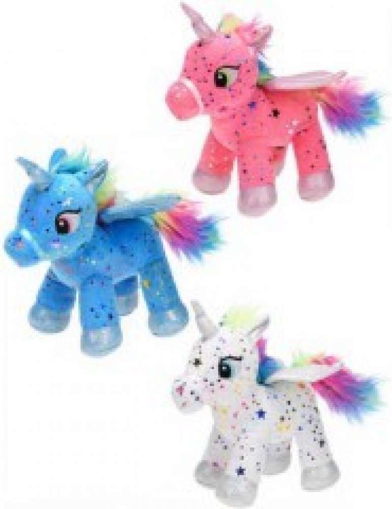 Krásný, okřídlený, třpytkový koníček s jedním růžkem, s duhovou hřívou a ocáskem, z plyše, ve třech barevných variantách, pro všechny malé princezny. Koník má tělo pokyrto barevnými hvězdičkami.