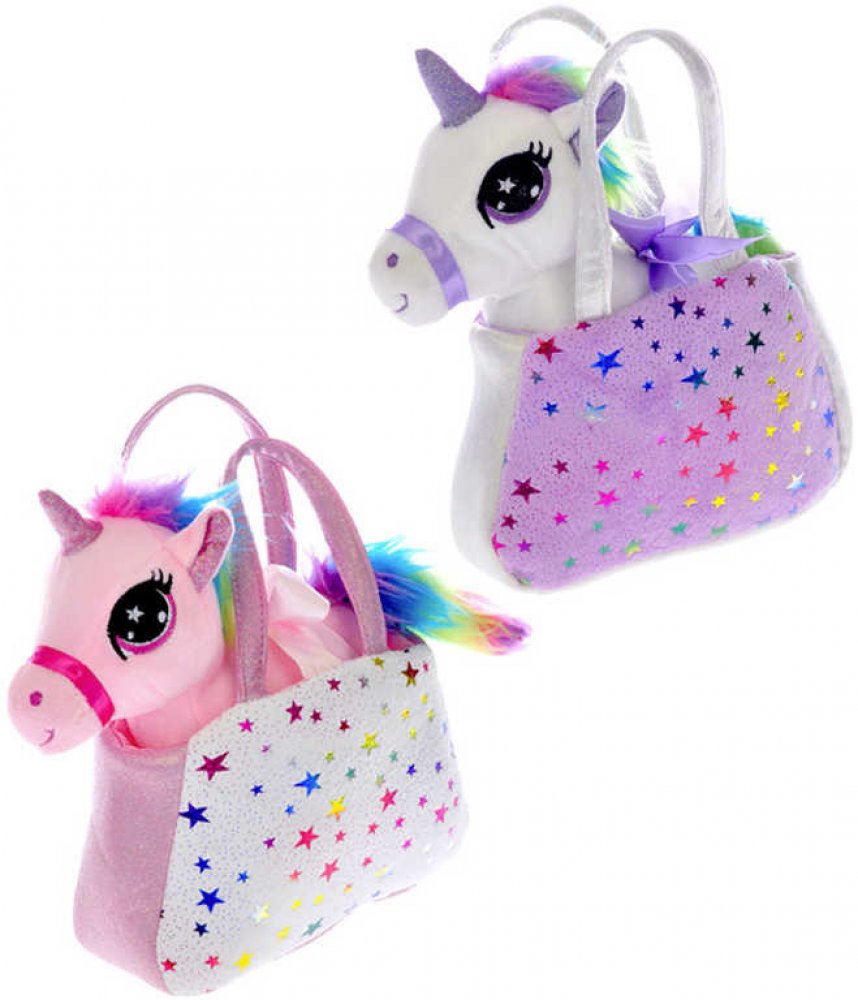 Pohádkový koníček jednorožec s duhovou hřivou a ocáskem z plyše, v sadě s kabelkou s hvězdičkami, ve dvou barevných variantách, pro všechny malé princezny.