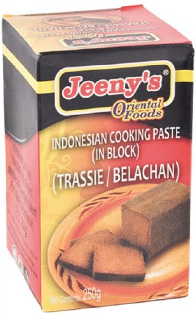 Trassie je indonéská krevetová pasta vyrobená z kvašených krevet, a pak sušená a stlačená do bloků. Zlatý hnědý Jeeny Popis produktu Indonéský styl pasty na vaření (v bloku) Složení: Kukuřičná mouka, sůl, krevety (Penaeus vannamei). Alergeny: krevety Země původu: Malajsie Hmotnost: 250g Nutriční hodnoty na 100g: Energie 750 kJ / Energie 180 kcal Tuk 4,5 g z toho nasycených 2,5 g Sacharidy 3 g Proteiny 31 g Sůl 27,5 g
