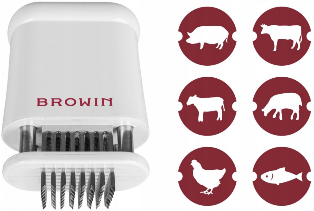 Napichovač masa Browin s pojistkou je kuchyňský doplněk, který umožňuje přípravu šťavnatých steaků a správné rozdrcení červeného masa. Model je vybaven 56 čepelemi z z nerezové oceli a zámkem chránícím před náhodným vysunutím hrotů.