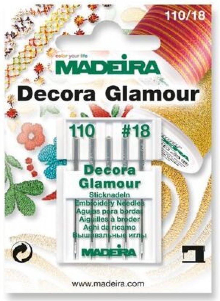 Jehly Madeira EMBROIDERY (5x110/18) Decora a Glamour Jsou vyšívací jehly určeny pro strojové vyšívání objemnými přízemi s kovovým efektem typu Decora, Glamour. Jehly jsou speciálně navrženy tak, aby se nit nepřetrhávala a vyšívání mělo co nejhladší průběh. Velikost jehly je 110/18. Balení obsahuje 5 kusů jehel. Detailní informace najdete uvnitř balení.