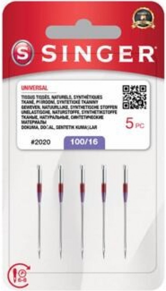 Jehly Singer 2020 univerzální pro šicí stroje (5x100) je sada 5 ks jehel o síle 100. Tyto univerzální (ostré) jehly jsou vhodné pro všechny šicí stroje Singer. V balení se nachází pět jehel velikosti 100. Jehly se používají pro šití tkanin. Tabulka výběru jehly: Druh jehly Velikost jehly Použití Typ nitě UNIVERSAL / STANDARD 75/11 90/14 středně těžké materiály (plátno, popelín, viskóza, podšívkovi...