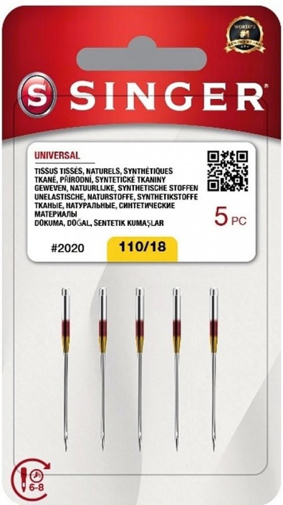 Značkové jehly Singer univerzální pro domácí šicí stroje, jehla s ploškou, 5ks, síla jehly je 110/18, značení 130/705 H. Tyto jehly můžete použít i na modely strojů jiných značek, např. Janome, Brother, Lada, Veronica, Juki, Lucznik, Veritas, Pfaff, Husqvarna Viking, Texi, atd. Vhodné pro stroje SINGER: MA, MB, MC, CA, CB, CC, CE, EA, EB, EC Povrch jehly je zinkovaný. Hrot jehly je zakulacený a ostrý, aby procházel tkaninou a nenařezával vlákna. Jehly jsou vhodné pro základní stehy. Síla jehly 110/18 značí, že se jedná o jehlu určenou pro velmi silné materiály jako je např. látka na kabáty, silné plátno, plachtovina. (Uvedené materiály jsou pouze jako reference k tloušťce materiálu.) Vhodné nitě jsou polyester opředený bavlnou/100% polyester/macerované/silon, velikost 40. Platí, že spodní a horní nit by měly být stejného typu a síly. Při šití speciálních materiálů, jako je např. úplety, jersey, denim, kůže/koženka, mikrotextlie doporučujeme použít pro nejlepší výsledek speciální jehly pro tyto materiály.Pro maximální výkon doporučuje společnost SINGER měnit jehlu každých 6-8 hodin šití. TIP: Značkové SINGER jehly pro klasické domácí šicí a vyšívací stroje nejsou zaměnitelné s jehlami pro overlock. Rozdílný design obalu SINGER nemá na kvalitu či původ výrobku jakýkoliv vliv. Pro maximální výkon doporučuje společnost SINGER měnit jehlu každých 6-8 hodin šití.