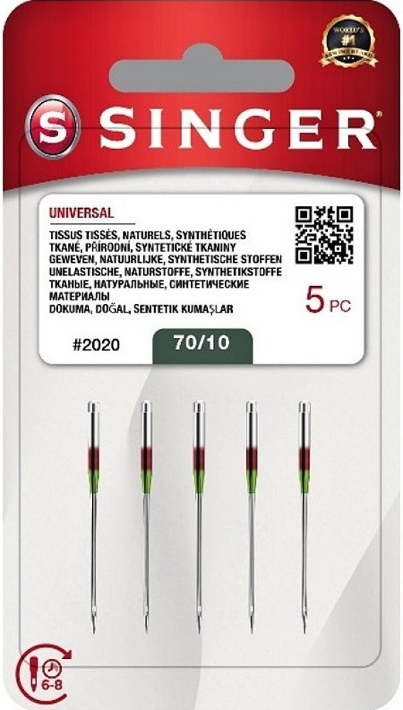 Značkové jehly Singer univerzální pro domácí šicí stroje, jehla s ploškou, jednodruhové balení po 5 kusech, síla jehly je 70/10, značení 130/705 H. Tyto jehly můžete použít i na modely strojů Janome, LIDL-Silvercrest, Brother, Lada, Veronica, Bernina, Juki, Lucznik, Veritas, Pfaff, Husqvarna Viking, Texi, Minerva, Redstar, Toyota, AEG, atd. Vhodné pro stroje SINGER: MA, MB, MC, CA, CB, CC, CE, EA, EB, EC Povrch jehly je zinkovaný. Hrot jehly je zakulacený a ostrý, aby procházel tkaninou a nenařezával vlákna. Jehly jsou vhodné pro základní stehy a některé dekorativní stehy, např. saténové. Síla jehly 70/10 značí tenkou jehlu určenou pro jemné materiály jako je např. batist, šifon, krep. Jedná se o univerzální jehly. Pokud budete pracovat s materiály jako je např. kůže/koženka, denim, doporučujeme použít pro nejlepší výsledek speciální jehly pro tyto materiály. Vhodné nitě jsou polyester opředený bavlnou/100% polyester/macerované, velikost 60. Spodní a horní nit by měly být stejného typu a síly.Pro maximální výkon doporučuje společnost SINGER měnit jehlu každých 6-8 hodin šití. TIP: Značkové SINGER jehly pro klasické domácí šicí a vyšívací stroje nejsou zaměnitelné s jehlami pro overlock. Rozdílný design obalu SINGER nemá na kvalitu či původ výrobku jakýkoliv vliv. Pro maximální výkon doporučuje společnost SINGER měnit jehlu každých 6-8 hodin šití.