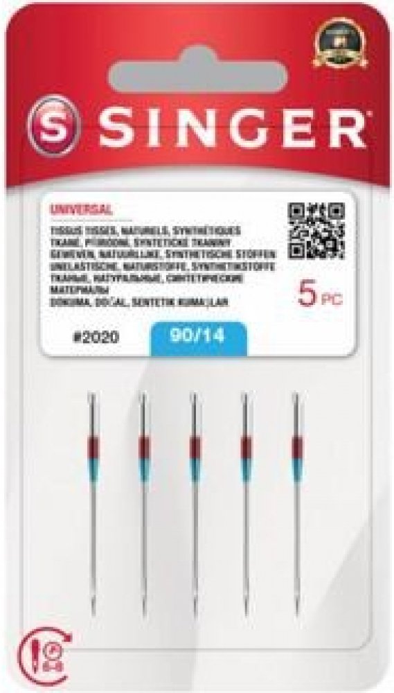 Jehly Singer 2020 univerzální pro šicí stroje (5x90) je sada 5 ks jehel o síle 90. Tyto univerzální (ostré) jehly jsou vhodné pro všechny šicí stroje Singer. V balení se nachází pět jehel velikosti 90. Tabulka výběru jehly: Druh jehly Velikost jehly Použití Typ nitě UNIVERSAL / STANDARD 75/11 90/14 středně těžké materiály (plátno, popelín, viskóza, podšívkovina, utěrky, kapesníky, ubrusy, většina ...