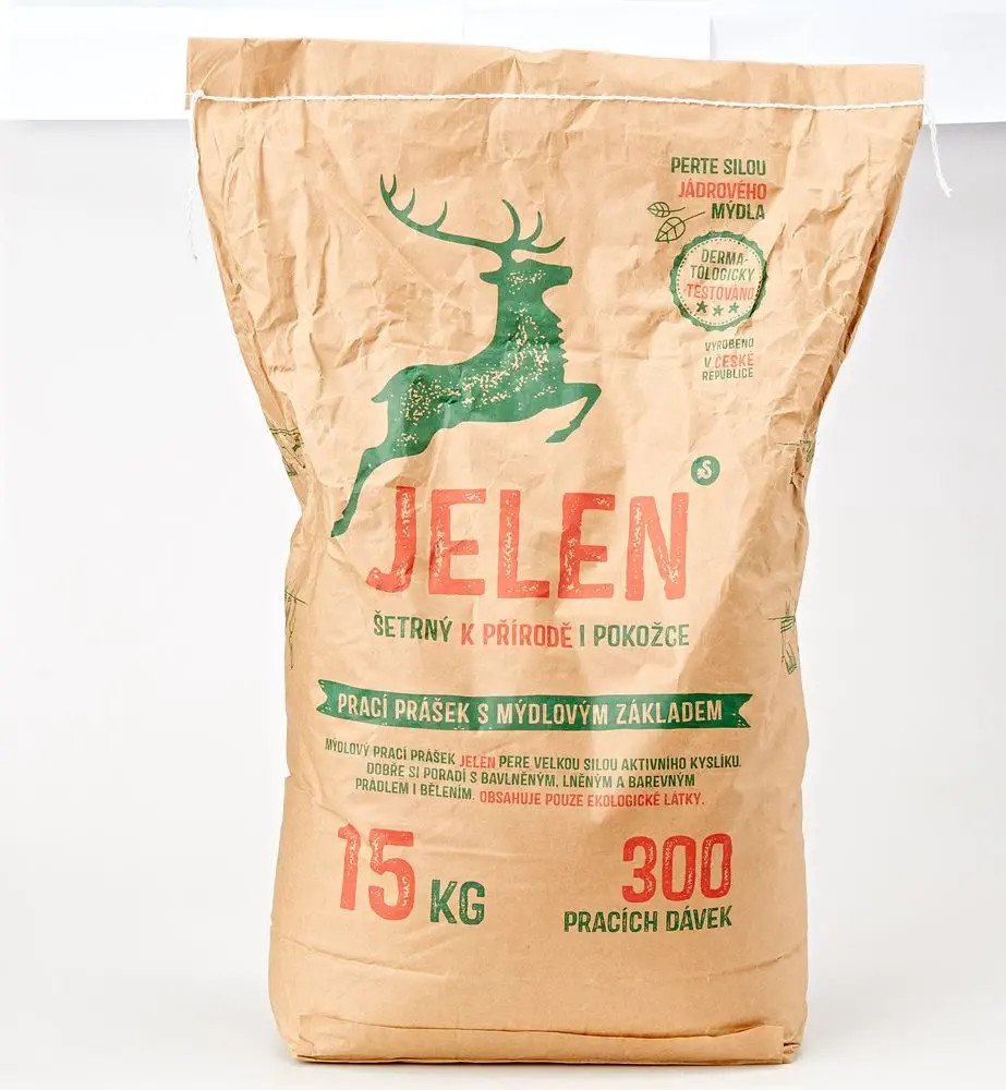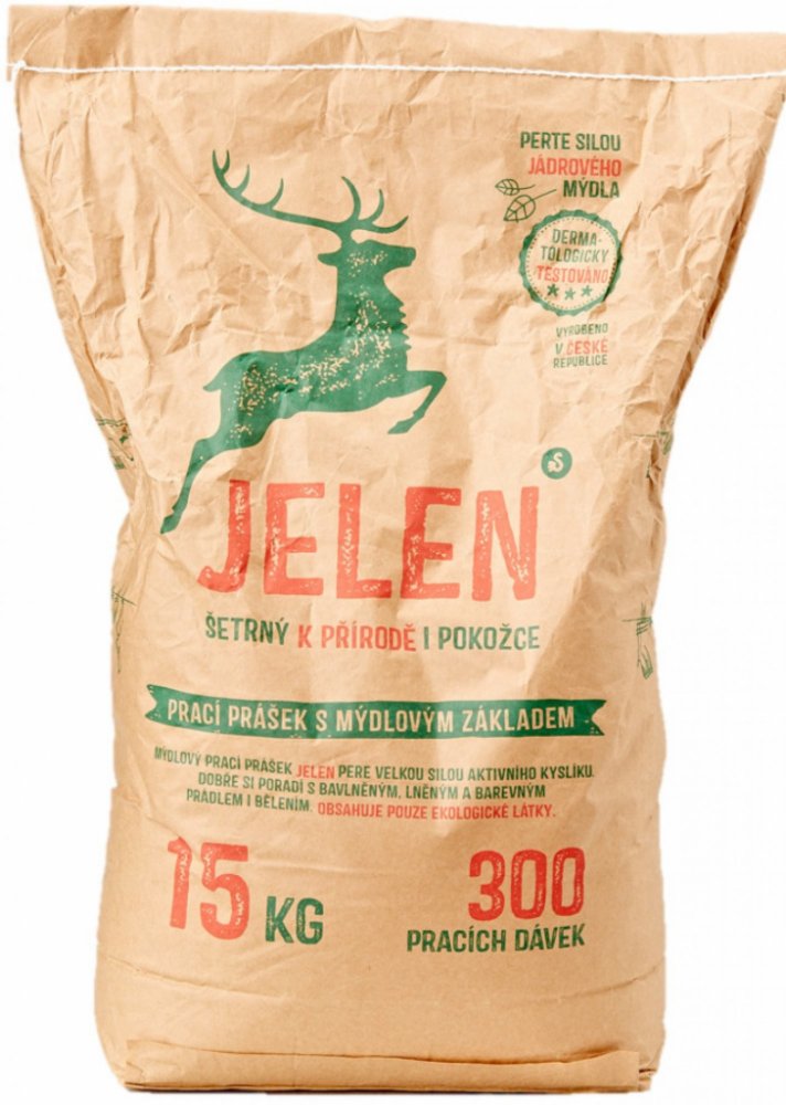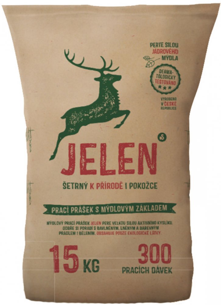 Mýdlový prací prášek Jelen pere i za vysokých teplot. Obsahuje kousky mýdla, což zvyšuje jeho účinnost. K pokožce však zůstává co nejšetrnější, což je doloženo i klinickým testováním SZÚ, dle kterého je prášek nedráždivý k pokožce a tedy vhodný i na praní oblečení osob s citlivou pokožkou a dětí do tří let.
