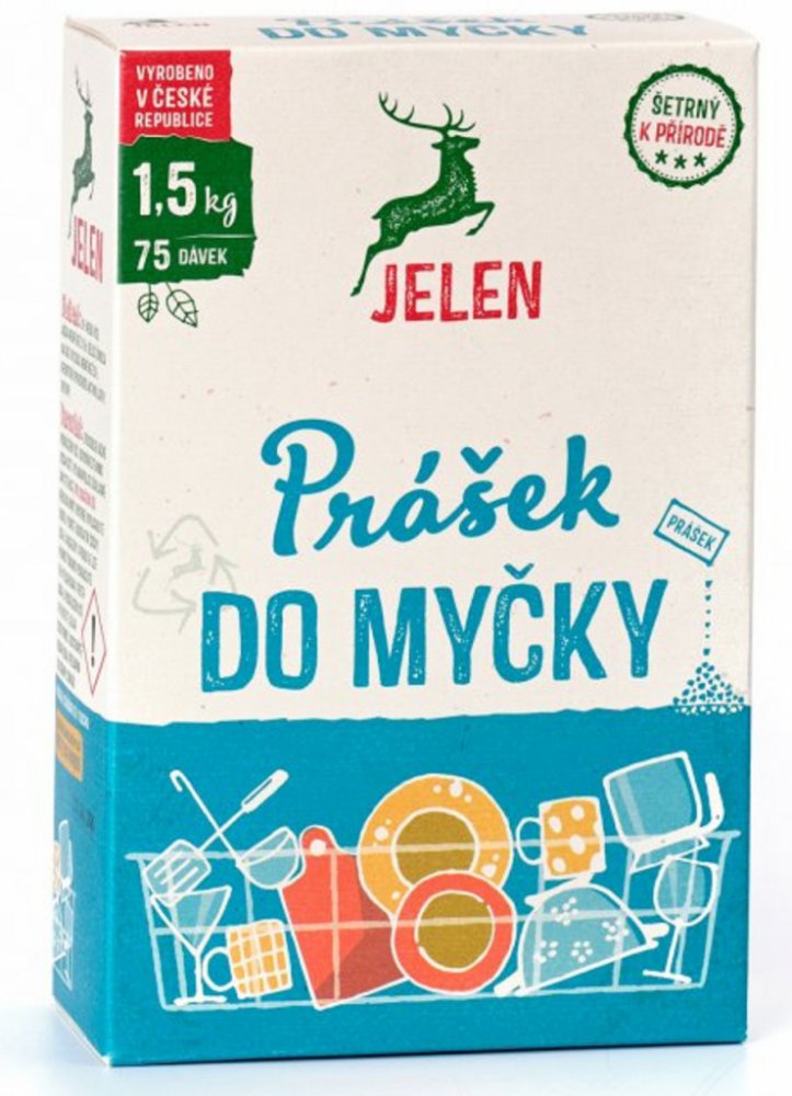 Jelení prášek do myčky obsahuje tenzidy přírodního původu a je vhodný i do domácích čističek odpadních vod. Zlepšuje lesk nádobí.