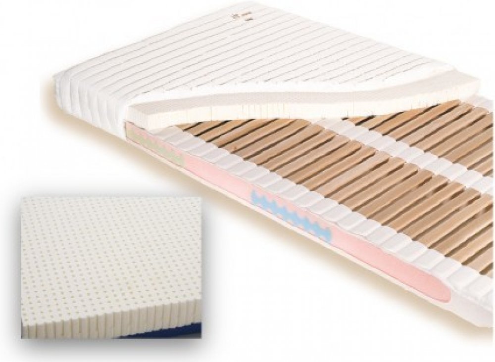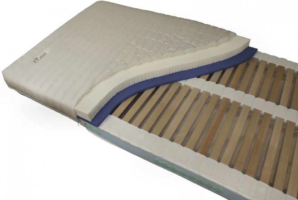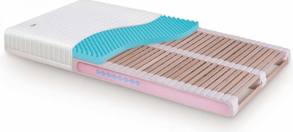 Nosníky Tři podélné nosníky jsou hlavním pružícím prvkem celé matrace. U jednotlivých typů matrací se liší v konstrukci, v systému pružení a v možnosti nastavení tvrdosti. Tvrdost pružení matrace je pak dána různou objemovou hmotností a tvrdostí PUR pěny v pružících hranolech. V oblasti ramen a kyčlí mají pružící nosníky tzv. ramenní resp. kyčelní změkčení. Roznášecí vrstva Na pružný lamelový rošt...