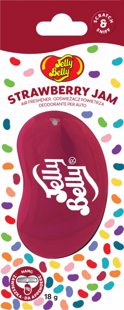 Osvěžovač vzduchu Jelly Belly 3D Air Freshener - Strawberry Jam - Jahodový Džem je lahodná a ovocná vůně do vašeho auta, které provoní po dobu 30 dnů. Má intenzivní jahodovou vůni s lehkým nádechem sladkého cukru.