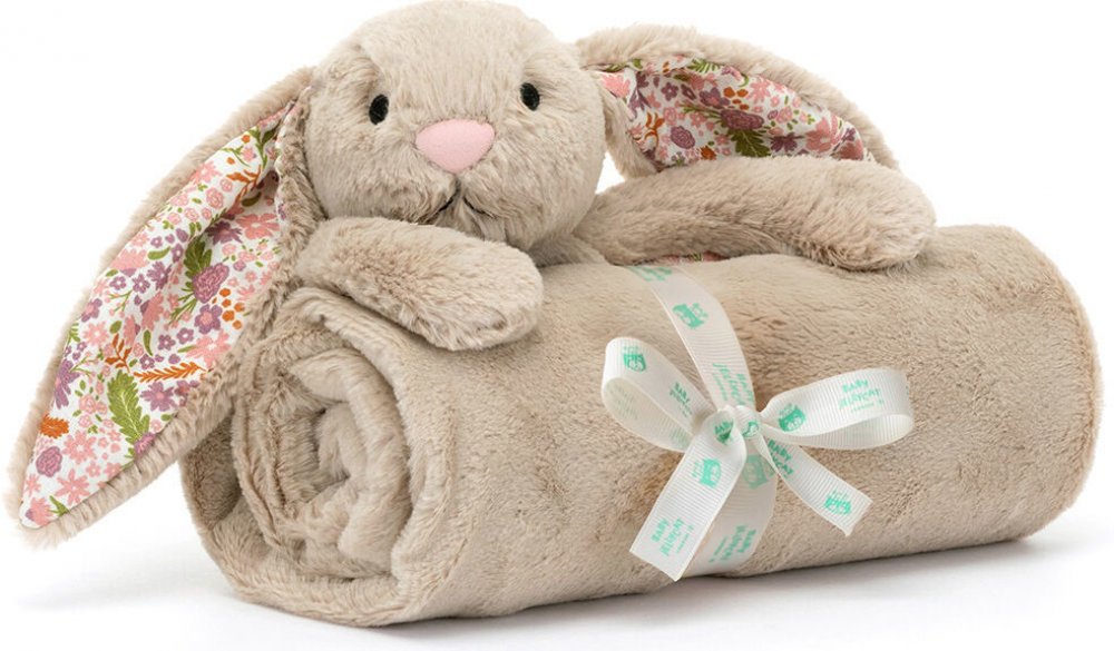 Tato rozkošná deka s králíčkem Blossom Beige 'Petal' je ideální pro uklidnění vašeho miminka a už se nemůže dočkat mazlení s vaším dítětem. Tato deka je vyrobena z luxusní super měkké recyklované látky a je ideální pro pohodlí vašeho nejmenšího. Tato úžasně pohodlná deka se zavazuje bílou stuhou s motivem Jellycat a je zdobena rozkošným králíčkem s dlouhýma ušima s květovým vzorem a měkkými ručičk...