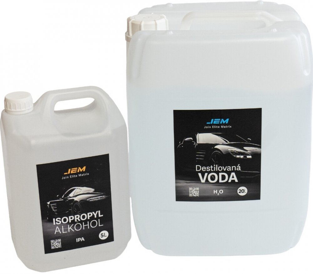 Isopropyl 5 l – Profesionální čistič pro přípravu povrchu před instalací PPF fólieIzopropylalkohol (IPA) o čistotě min. 99 % ve větším, ekonomickém balení 1 litr je ideální pro profesionální přípravu povrchu před aplikací PPF fólií. Spolehlivě odstraňuje mastnotu, prach, vosky i zbytky leštidel a zajišťuje perfektně čistý podklad bez zbytků a šmouh.Díky svému rychlému odpařování a šetrnosti k povrchu je vhodný nejen pro karoserii, ale i pro plastové a skleněné díly. Může být použit samostatně nebo jako součást instalační směsi s destilovanou vodou. Objem 1 l je vhodný pro pravidelné použití v dílnách i mobilních aplikacích.Vhodný pro:Přípravu laku před lepením PPF fólieČištění povrchů při detailinguMíchání instalačních roztoků Destilovaná voda 20 l – Profesionální objem pro dílny a instalatéryVelké balení vysoce čisté destilované vody ideální pro profesionální instalace PPF fólií. Vhodná jak k míchání s dalšími složkami, tak pro samostatné použití – zajišťuje šetrnou a přesnou aplikaci bez zbytkových stop a usazenin. Tyto produkty vyrábíme sami, což nám umožňuje garantovat jeho kvalitu a flexibilitu výroby. Jsme schopni vyrobit a dodat jakékoliv množství – ať už potřebujete jeden kus nebo velkou sérii, přizpůsobíme se vašim požadavkům. Pro individuální objednávky nebo velkoobchodní poptávky nás neváhejte kontaktovat. Aplikace PPF JEM:Jeli-to možné odstraňte z vozu díly, které by mohly uvolnit nečistoty při lepení ( značky, lišty, nápisy, světla, kliky atd.)Velmi pečlivě vozidlo umyjte. Odstraňte veškerou kontaminaci na laku (asfalt, polétavou rez, zbytky lepidla od ochranné folie použité při přepravě nového vozu atd.)Po ustavení na místo aplikace je vhodné použít kryty kol a připojit vozidlo na udržovací zdroj.Snažte se při práci eliminovat prašnost v okolí vozu a nelepte v oblečení, které by mohlo uvolňovat žmolky.Suchá PPF je po odlepení nosné vrstvy je nabitá statickou elektřinou proto je důležité pracovat tak aby se nenachytaly částečky prachu na stranu s lepidlem.Používejte správný roztok a techniku lepení abyste zamezili poškození lepidla a tím vzniku nežádoucích strií, bublinek, trhu v lepidle atd.Odmastěte hrany lepeného dílu čistým IPA a každý díl před lepením dekontaminujte soft clayem.Na lepený díl a na obě strany PPF lehce nastříkejte roztok šamponu a destilované vody (destilovaná voda nenechá na vozidle po zaschnutí fleky) do 500ml vody dejte 2 - 2,5ml šamponu (více šamponu je vhodné při vyšší teplotě na dílně nebo při lepení složitého dílu)Roztok šamponu ochrání lepidlo při manipulaci a ustavování PPF na daný díl, ale lepidlo nebude aktivováno na laku. Proto je nutné ho vymýt čistou vodou nejlépe opět destilovanou, nalitou v tlakovém postřikovači ve větším množství.Pro ustavení a napnutí materiálu chytáme rohy fólie na okolních dílech a roztok šamponu vymýváme pokud možno vždy mimo díl na který je aplikována PPF (kapotu zachytíme na blatnících a dole na světlech a nárazníku)Přebytečný roztok šamponu pečlivě vystěrkujte, aby nebyly nikde zbytky roztoku nebo bublinky, kraje vymyjte čistou vodouV případě že potřebujete uchytit materiál ihned napevno použijte roztok destilované vody a IPA v poměru 1:3Vysušte nalepenou fólii ručníkem a zkontrolujte jestli nejsou nikde pod fólií nečistoty nebo zbytky vodyPřebytečný materiál dle potřeby a typu dílu odřežte 3-4mm na zahnutí za hranu.Zahněte ihned pomocí netkané textilie a horkovzdušné pistole. Z hran postupně vytlačte všechnu vodu a zároveň zahřívejte stranu kde je lepidlo horkovzdušnou pistolí nastavenou na 650CVozidlo můžete předat za 24-48 hodin dle ročního obdobíJEM PPF s.r.o. je výhradní dovozce ochranných fólii PPF vyráběných společnosti JEM. Nabízíme veškerou dokumentaci, technologii a kvalitu, která je zaručena dlouholetými zkušenostmi asijského trhu. Z důvodu přímého napojení na výrobce jsme schopni nabídnou výrobu všech druhů PPF fólii na objednávku dle požadavků klienta. Zajištujeme veškerou dokumentaci od pojištění, naložení, dopravu, odbavení, vyložení a dovoz na místo určení dle požadavků klienta.