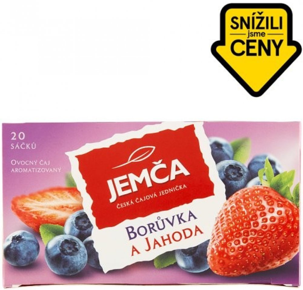 Borůvka a jahoda 40 g, ovocný čaj aromatizovaný (porcovaný v nálevových sáčcích). Složení: Jablečná dužnina, květ ibišku súdánského, borůvkové aroma (včetně koncentrovaného borůvkového džusu), list ostružiny, jahoda 1 %, borůvka 1 %, jahodové aroma (včetně koncentrovaného jahodového džusu), šípky.