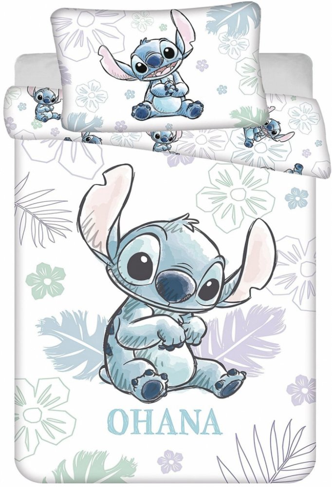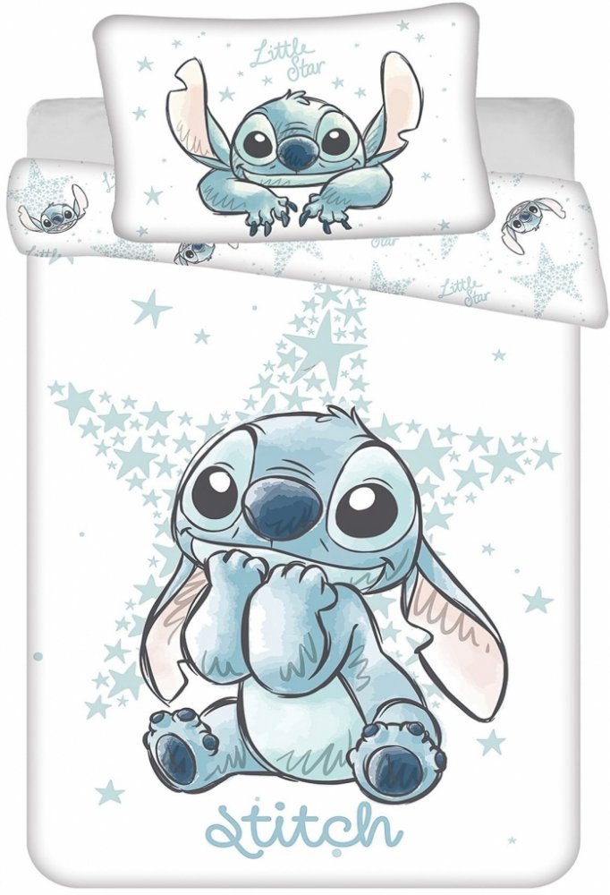 Dětské bavlněné povlečení do postýlky se vzorem malého pejska Stitche z animované komedie Lilo a Stitch na bílém podkladu s s hvězdami. Povlečení je oboustranné z druhé strany jsou malé postavičky s hvězdami na bílé. Souprava je vyrobena ze 100% bavlny a obsahuje jeden povlak na přikrývku 100 x 135 cm a jeden povlak na polštář 40 x 60 cm. Zapínání na zip.