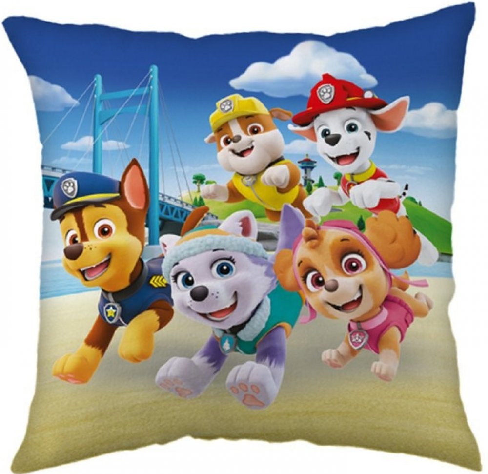 Veselý polštářek s motivem oblíbené Tlapkové patroly potěší každého malého fanouška. Chase, Everest, Skye a Marshall běží po písečné pláži směrem k dobrodružství, zatímco v pozadí se klene modrý most pod modrou oblohou s bílými mraky. Rozměr 40×40 cm, ideální do dětského pokoje. Barevný a hravý design