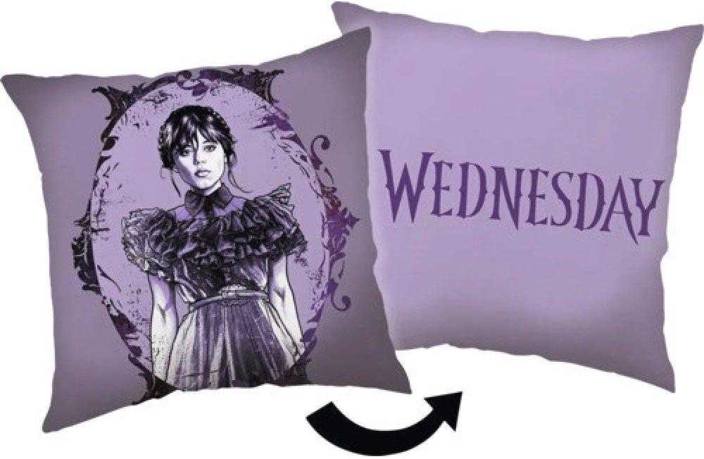 Licenční polštářek s motivem Wednesday. Rozměr polštářku je 40x40 cm. Stylový doplněk pro fanoušky temného kouzla a originální atmosféry seriálu.