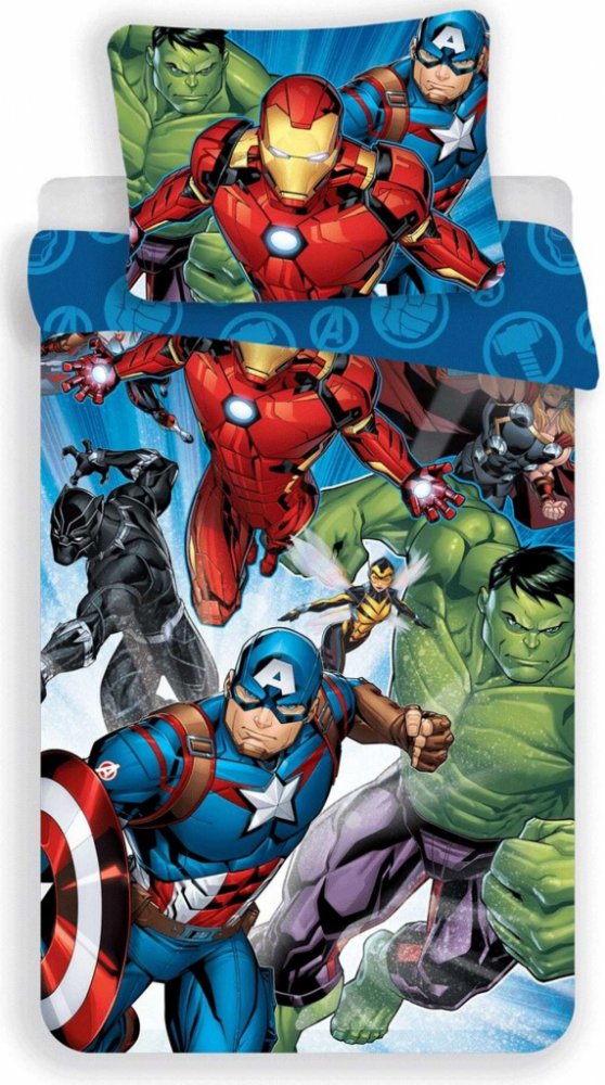 Na modrém pozadí se vyjímají oblíbené postavy jako Iron Man, Captain America, Hulk a další v dynamických pózách. Rozměr 140×200 cm (přikrývka) a 70×90 cm (polštář) je ideální pro všechny malé fanoušky Marvel světa.