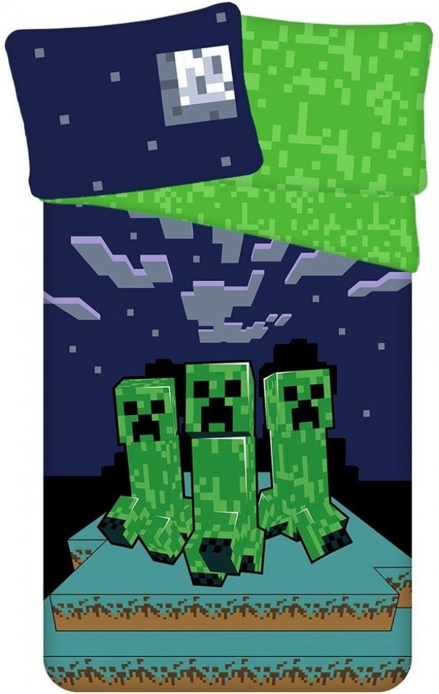 Usínejte s pocitem, že jste součástí Minecraft světa – pod hvězdami a s Creepery nablízku! Povlečení Minecraft Sssleep Tight přináší autentický herní zážitek přímo do postele. Přikrývku zdobí tři Creepeři stojící na typickém blokovém terénu s noční oblohou plnou hvězd a pixelovaných mraků. Polštář doplňuje tmavě modrý motiv s měsícem a hvězdami, zatímco druhá strana přikrývky nabízí zelený pixelový vzor připomínající herní textury.