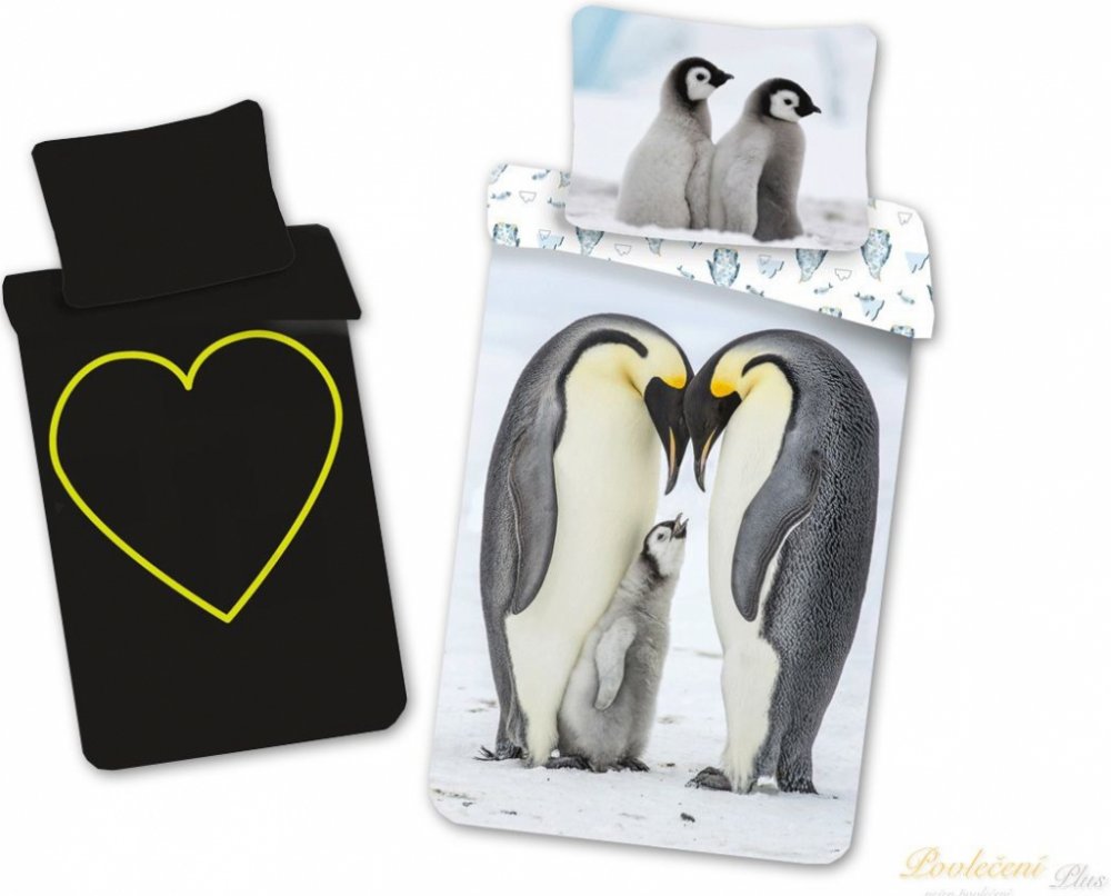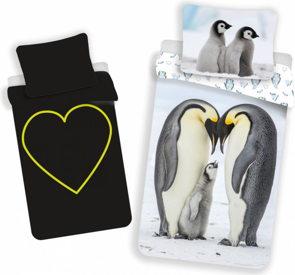 Toto povlečení je perfektní volbou pro děti i dospělé, kteří chtějí usínat s pocitem klidu a blízkosti přírody. Přikrývku zdobí roztomilý motiv dvou dospělých tučňáků císařských chránících mládě, zatímco polštář zobrazuje dvě mláďata na sněhu. Celý design působí jemně a harmonicky.