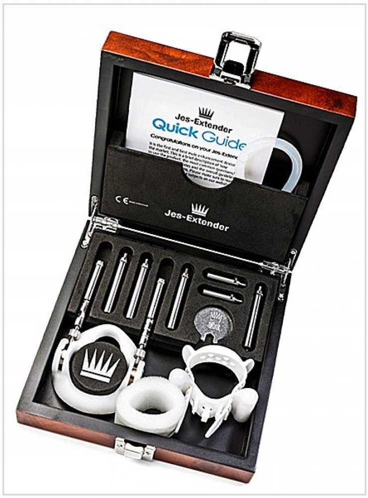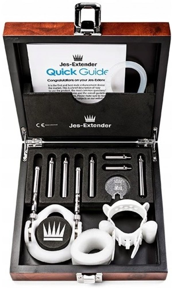 Jes-Extender Original je dodáván s: - Základní jednotka - Přední část s dvojitou funkcí - Silikonová trubice - Komfortní popruh - Čtyři 5centimetrové prodlužovací tyče - Dvě prodlužovací tyče 2,5 cm - Chránič - Sada klíčů