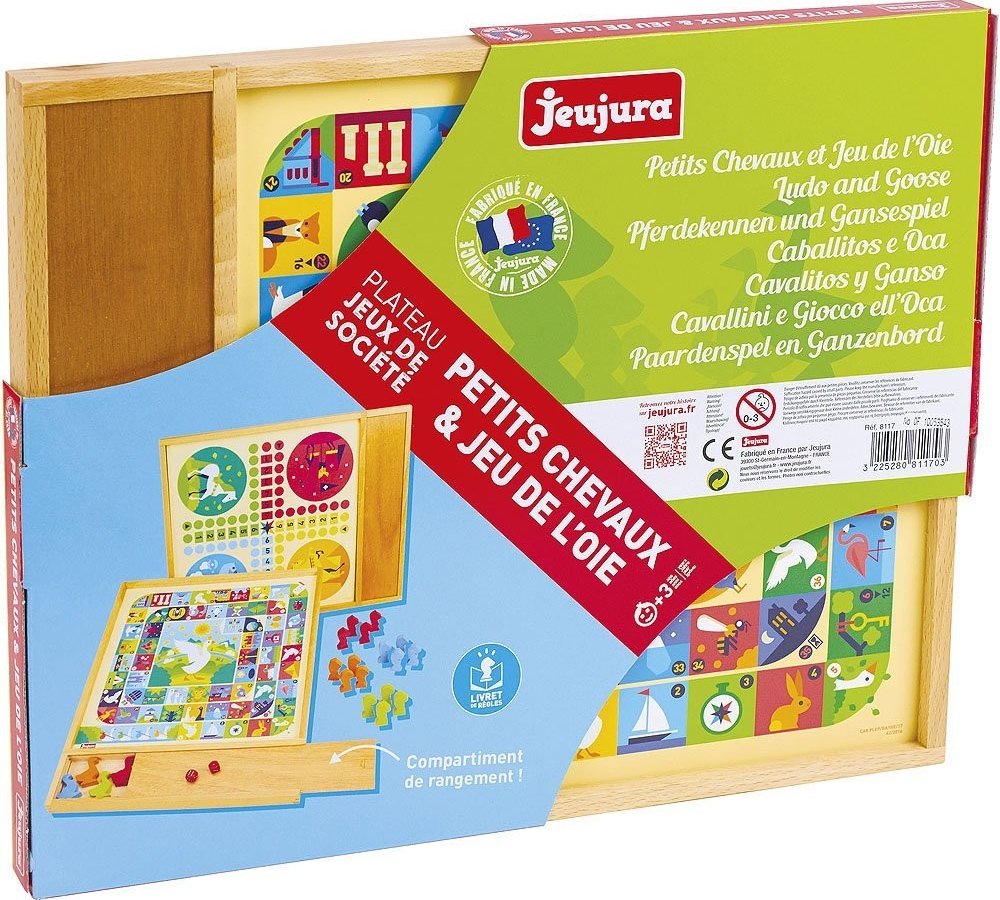 Deska s dvojicí her a pouzdrem na příslušenství. Obsahuje husu a variantu člověče nezlob se s figurkami koní. Souprava je vyráběna ve Francii, z masivního bukového a borovicového dřeva francouzského původu. Součásti jsou ošetřeny výhradně za použití barev a laků na bázi vody. Hlavní vlastnosti:pro 2–4 hráče8 figurek koní, 4 figurky hus a 2 kostkyvše...
