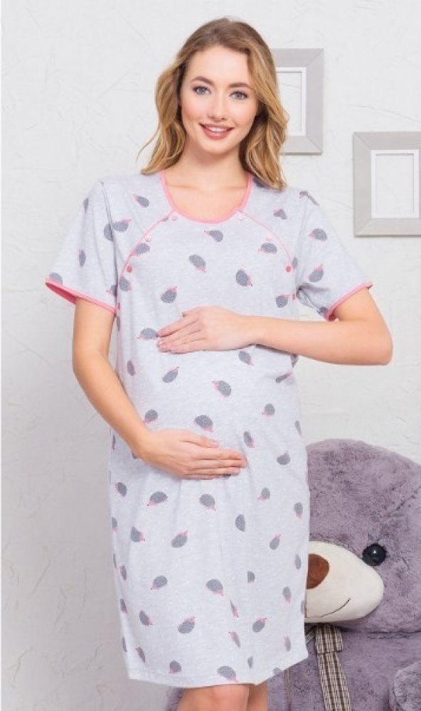 Ježek - mateřská noční košile, s oboustranným rozepínáním, na knoflíky, pro pohodlné kojení. Šedá noční košile, s červeným olemováním výstřihu, rozepínání a konců rukávů. Košile je celá potištěná - všude samý ježek...