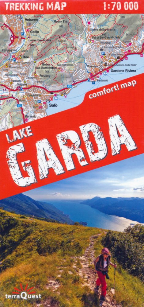 Oboustranná turistická mapa okolí jezera v měřítku 1:70 000 v laminované úpravě. Výškopis znázorněn pomocí vrstevnic po 25 metrech, stínovaný reliéf, zeměpisné souřadnice, turistické liniové značení, turistické chaty, kempy, bivaky, parkoviště, lanovky, silniční síť s kilometráží. Zobrazené území: JV - Verona, JZ - Castiglione delle Stiviere, SZ - Cima Tombea (1946 m n.m.), S - Monte Misone (1803 ...