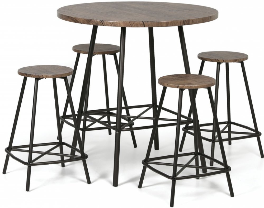 Moderní jídelní set s nádechem industriálního stylu perfektně zapadne do každé kuchyně, jídelny nebo i barového koutu. Skládá se ze čtyř barových židlí a jednoho vyššího stolu, díky čemuž je vhodný nejen jako klasická jídelní sestava, ale i jako praktické řešení pro neformální posezení, snídaňový bar či menší gastro provoz. Jídelní set je sladěný do dekoru dubu Wellington s výraznou kresbou dřeva ...
