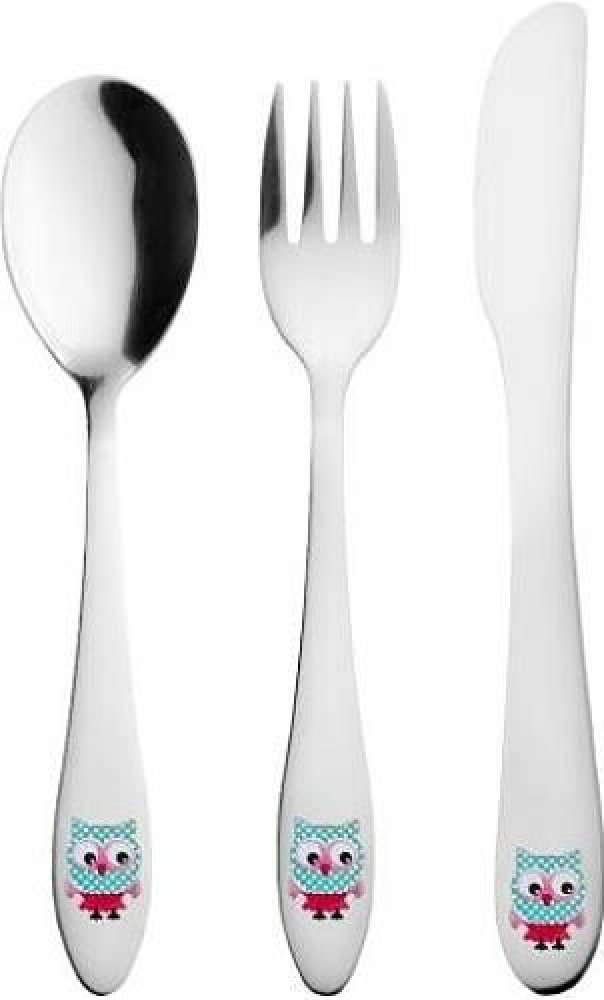 Dětský příbor s barevným dekorem sovy. Obsahuje 3 ks - lžíci, vidličku a nůž. Materiál: kvalitní nerez. Tvar přizpůsobený dětem. Lze mýt v myčce na nádobí, ale nedoporučujeme, mohlo by dojít k porušení barevného dekoru, což později nemůže být důvodem reklamace. Rozměry: (délka/šířka) lžíce 15,5/3,5 cm, vidlička 15,5/2,5 cm, nůž 17/2 cm.