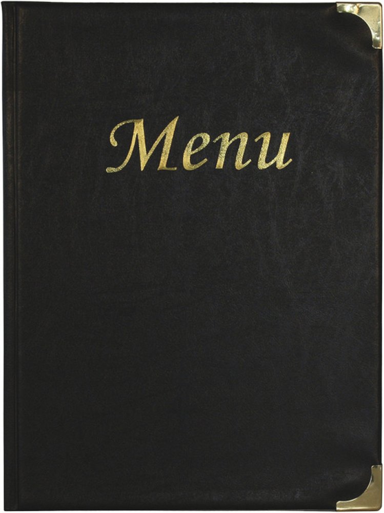 Jednoduché jídelní lístky z PVC s vytlačenými zlatými nápisy a kovovými ochrannými růžky. Mají 4 pevně uchycené vložky, celková kapacita je 10 stran nabídky. U jídelních lístků řady BASIC není možné měnit nebo přidávat vložky. Formát: A4 Provedení: Bla