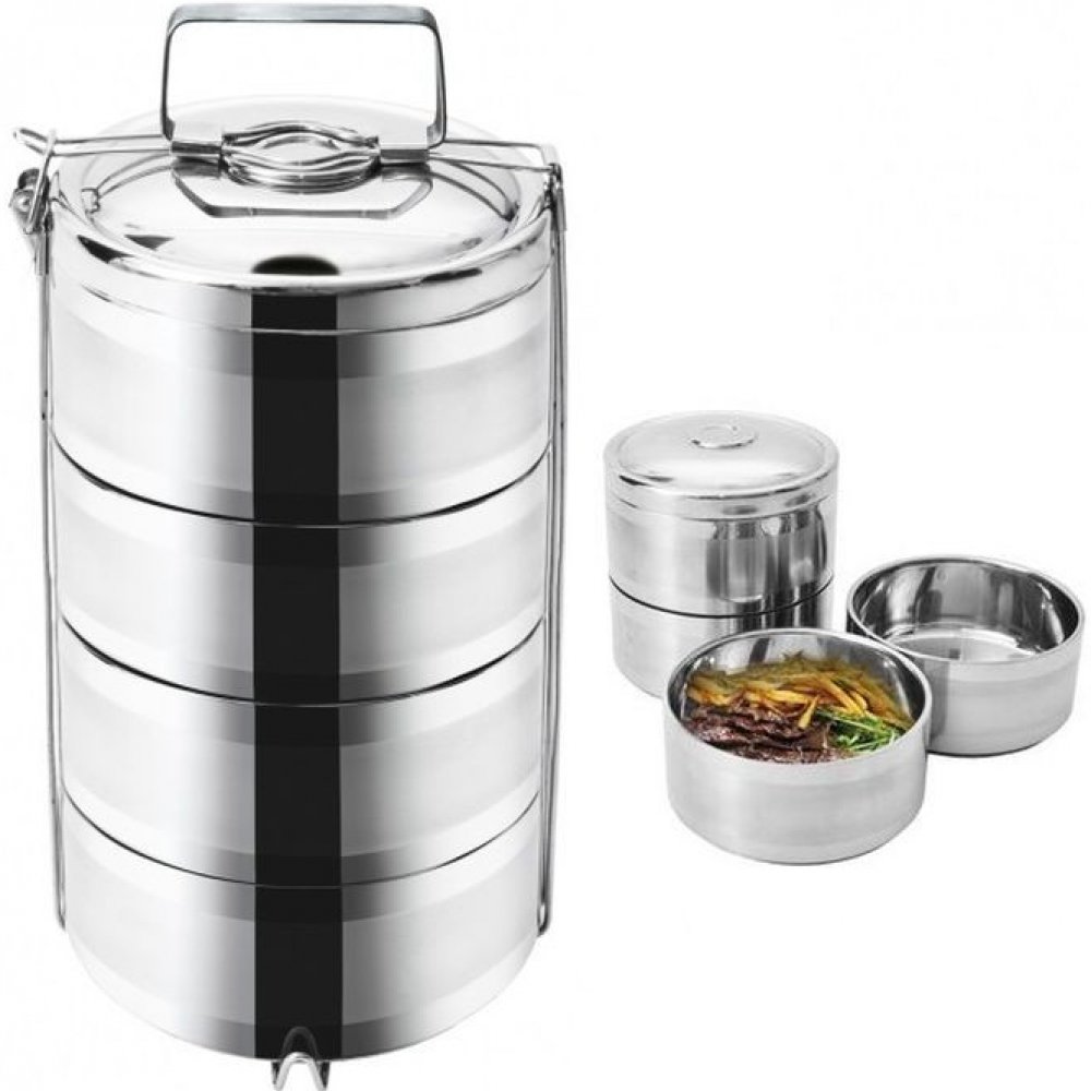 Termojídlonosič 4 patra pro přenášení pokrmů dlouho zachová jejich teplotu. Součástí je kovový stojan, opatřený přezkou, která zajistí jeho pevné uzavření a vrchní poklice.