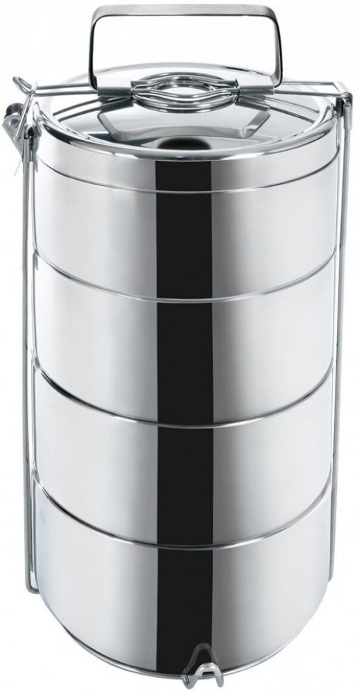 Obsahuje 4 nerezové dvoustěnné misky o objemu 0,9 l. Misky jsou ideální pro uložení celého menu, polévky, hlavního jídla, samostatné přílohy a dezertu. Jeho součástí je také kovový stojan, který umožňuje skládání nádob na sebe a zároveň je opatřený přezkou sloužící k jejich pevnému zajištění.