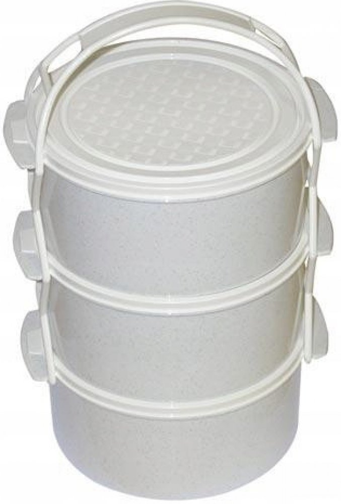 Box na ukládání a přepravu jídla, složený ze 3 dílů, které jsou navzájem propojené držadlem.