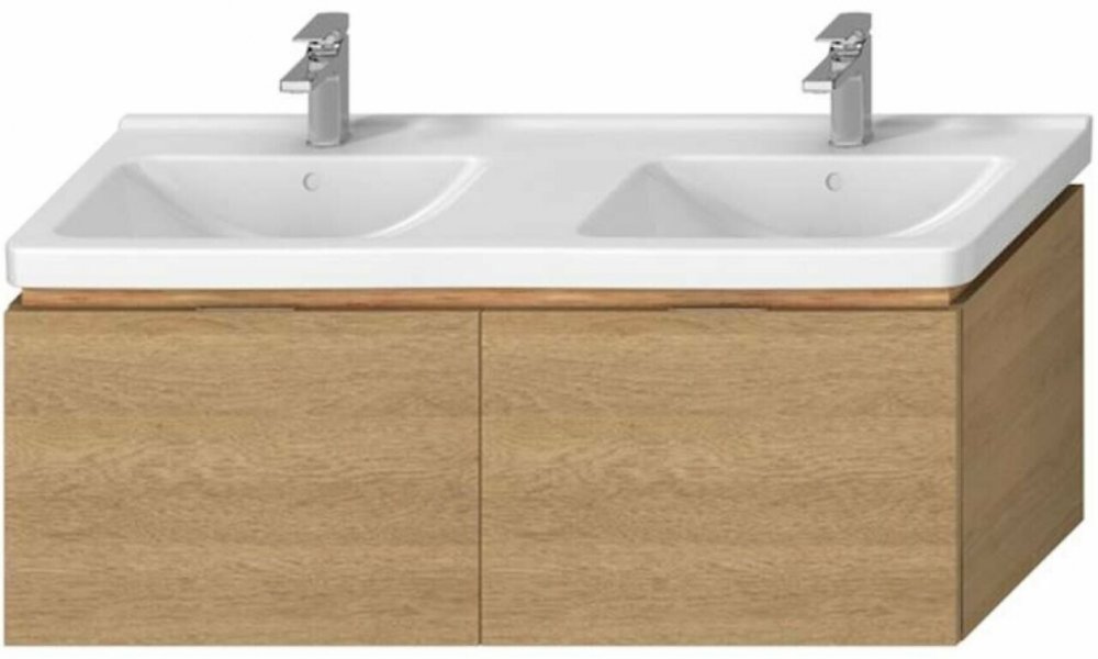 Skříňka pod dvojumyvadlo 130 cm, 2 zásuvky provedení dub rozměr šířka 1280 mm, výška 480 mm, hloubka 467 mm úchytky zapuštěné do hrany dvířek s brzdou dovírání hrany ABS 2 zásuvky Umyvadlo a baterii je nutné objednat zvlášť. Pod umyvadlové skříňky doporučujeme prostorově úsporný sifon Jika. POZOR, rozteč rohových ventilů v tomto případě musí být 200 mm. Ilustrativní foto