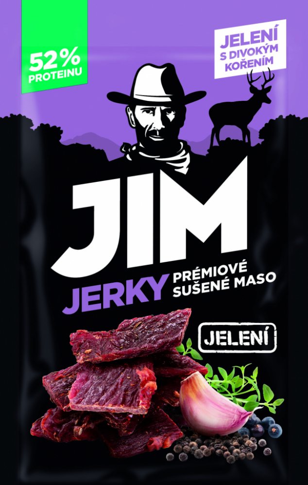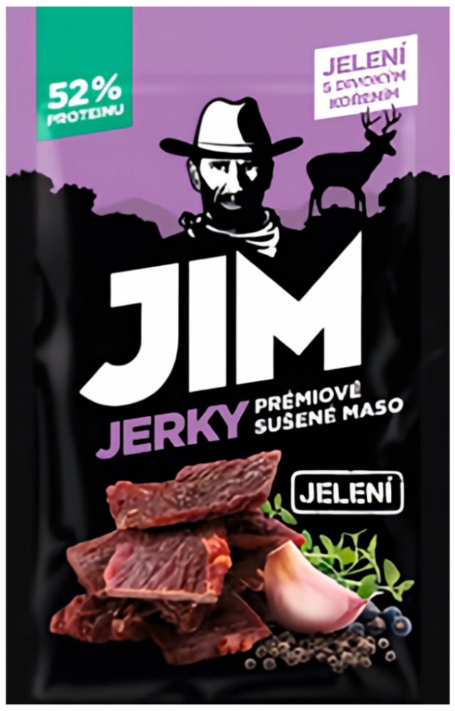Jim Jerky Jelení 23 g Ideální svačina na cesty i na doma. Svačina je plná energie, která vám bude zaručeně chutnat. Poctivé zvěřinové maso s vysokým obsahem proteinu, který je pro každého z nás nezbytný, a to nejen při sportování. Sušené maso si můžete dopřát kdykoliv během dne a navíc bez výčitek. Ať už jste v práci, doma nebo na cestách. Složení: Jelení maso min. 90 %, směs koření, mořská sůl. S...