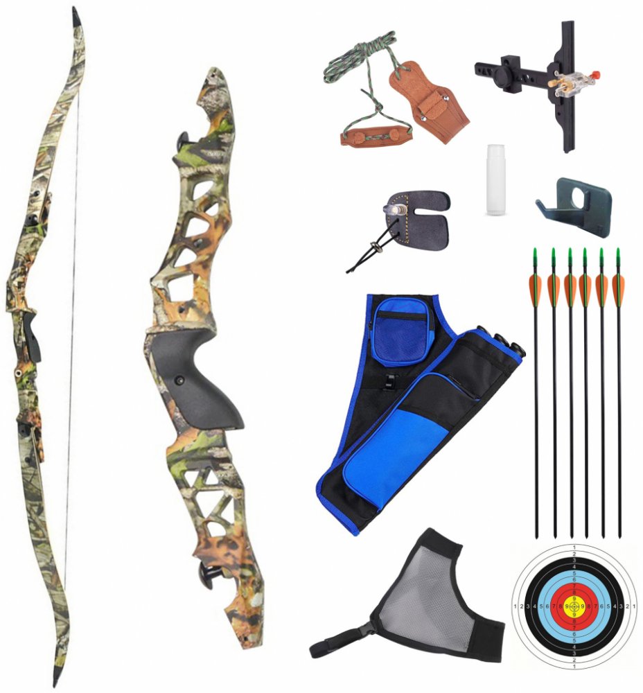 Reflexní luk Eagle Camo délky 60" a nátahové síly 30 lbs. Pravoruké provedení. Střed luku je vyroben z duralové slitiny v hnědém camo provedení. Je opatřen otvory pro upevnění stabilizátoru, mířidla a základky. Ramena jsou vyrobena z javoru a sklolaminátu. Součástí balení je T mířidlo, 3x základka šípu, 6 ks 30" sklolaminátových šípů, pouzdro na šípy, chránič prstů, chránič hrudi, vosk, papírový t...