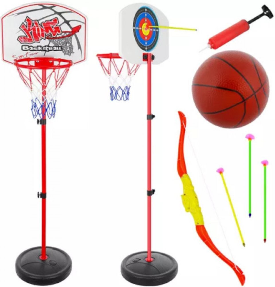Basketbalový koš se stojanem, který je součástí sady spolu se střeleckým terčem, lukem a šípy, a má nastavitelnou výšku od 73 do 146 cm, je kompletní sada pro zábavné venkovní aktivity a trénink.